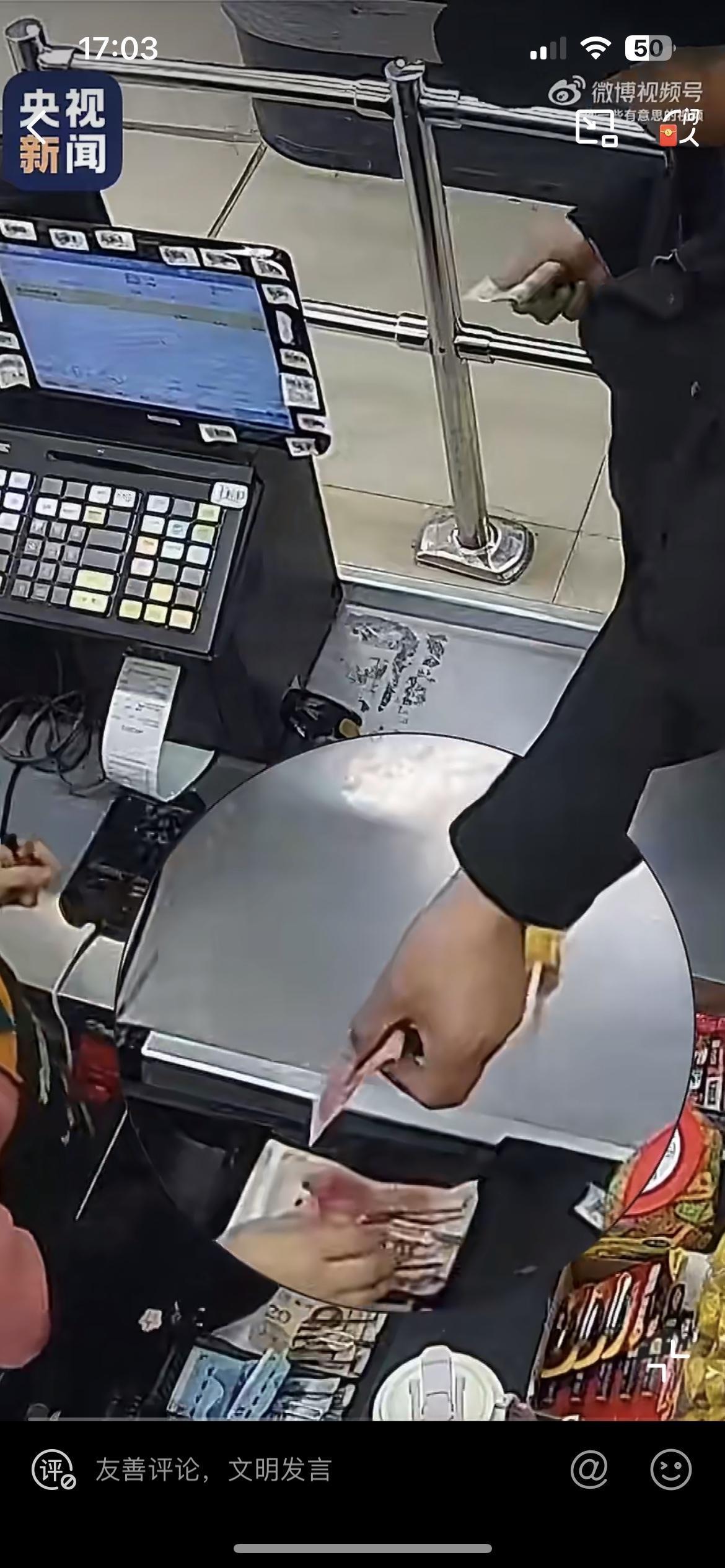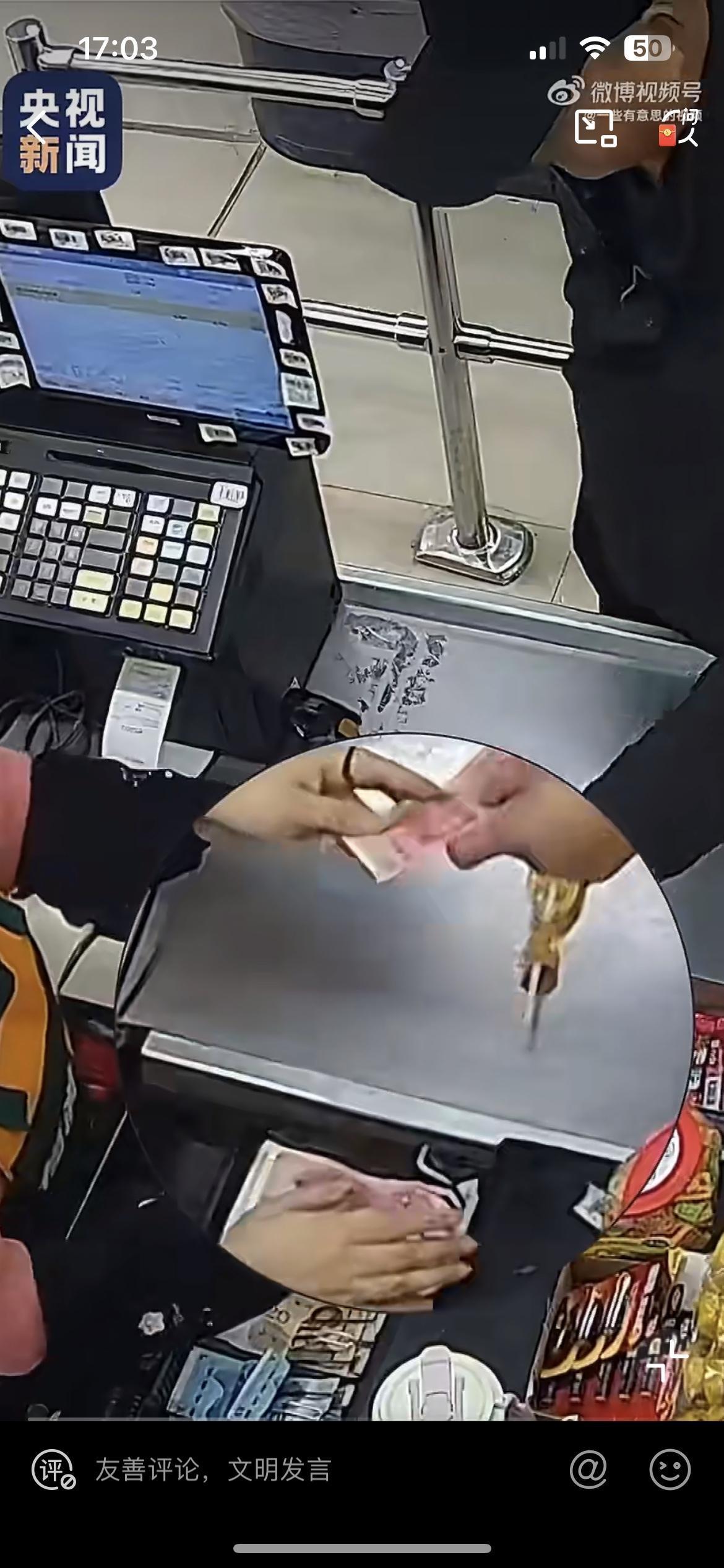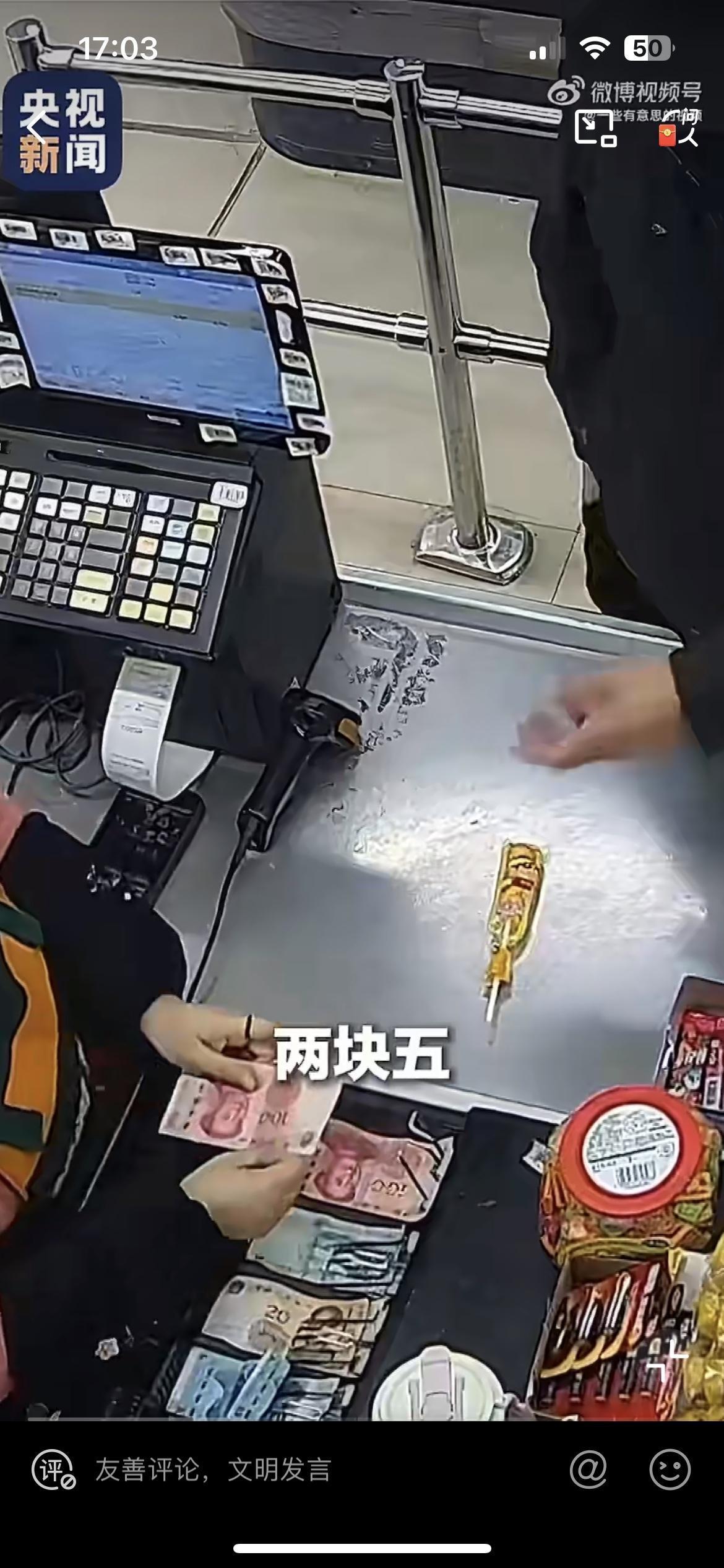 男子买一个棒棒糖,2块5,拿出100元递给收银员。