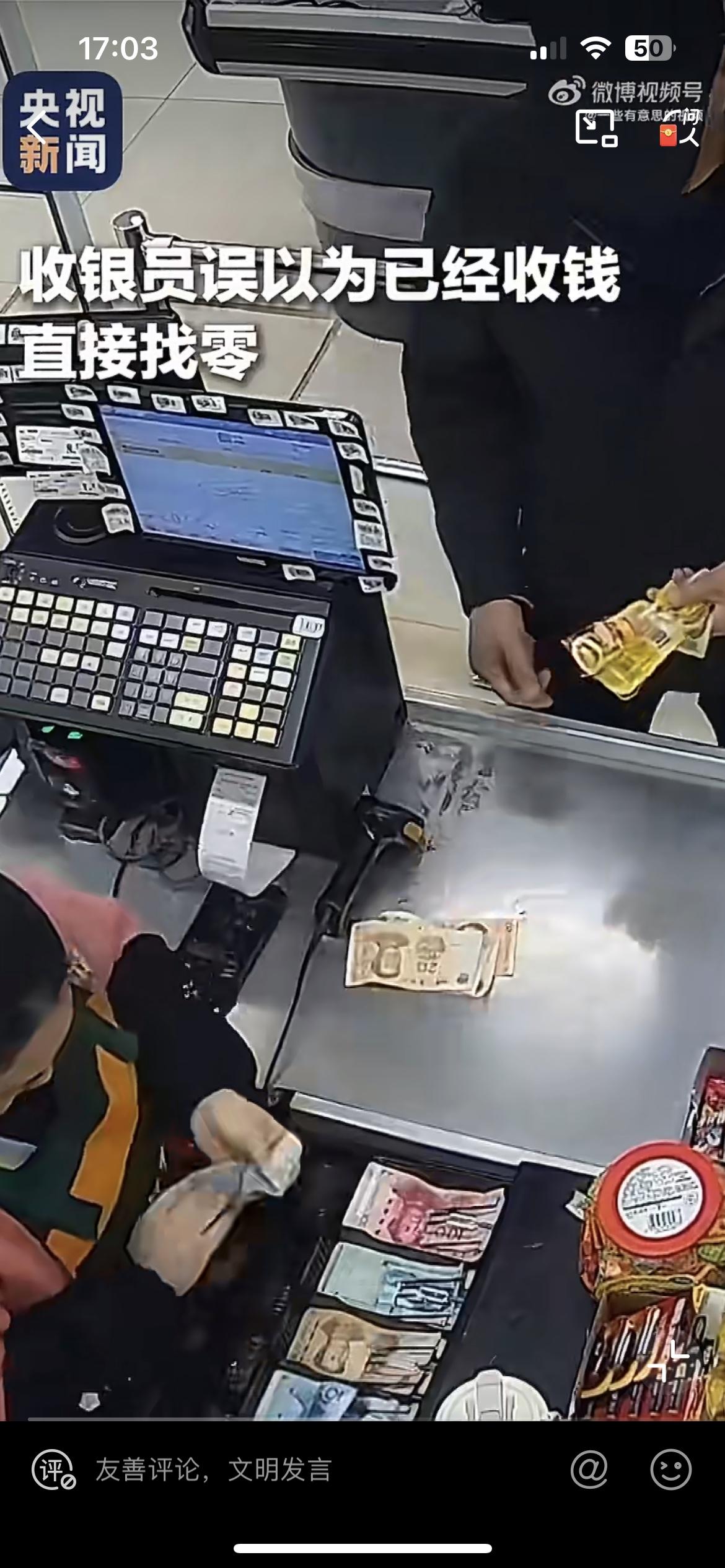 收银员被带乱节奏,按惯性继续找零,男子得逞后立刻走人。
