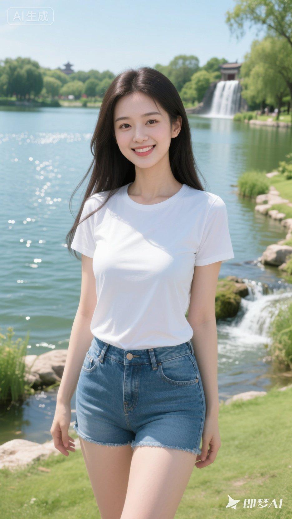 夏日清新穿搭,白色T恤+牛仔短裤,阳光下的美好时光