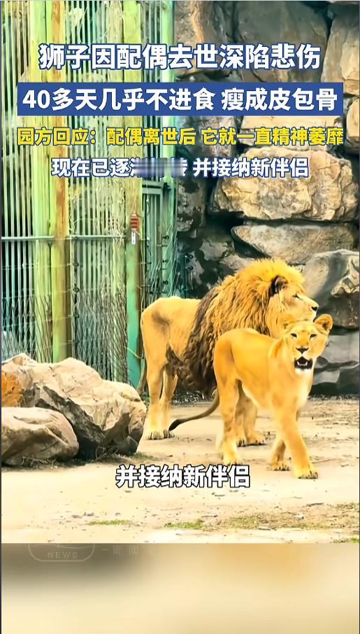 “比人还痴情?”近日,辽宁本溪,有网友发视频称,动物园里有一头狮子,被饿的皮包骨了,引发网友热议。当地动物园回应,这头狮子去年失去了伴侣,意志消沉,连续四十天不吃东西。现在已经接纳了新配偶,开始恢复了!网友:刚想夸是头痴情狮!