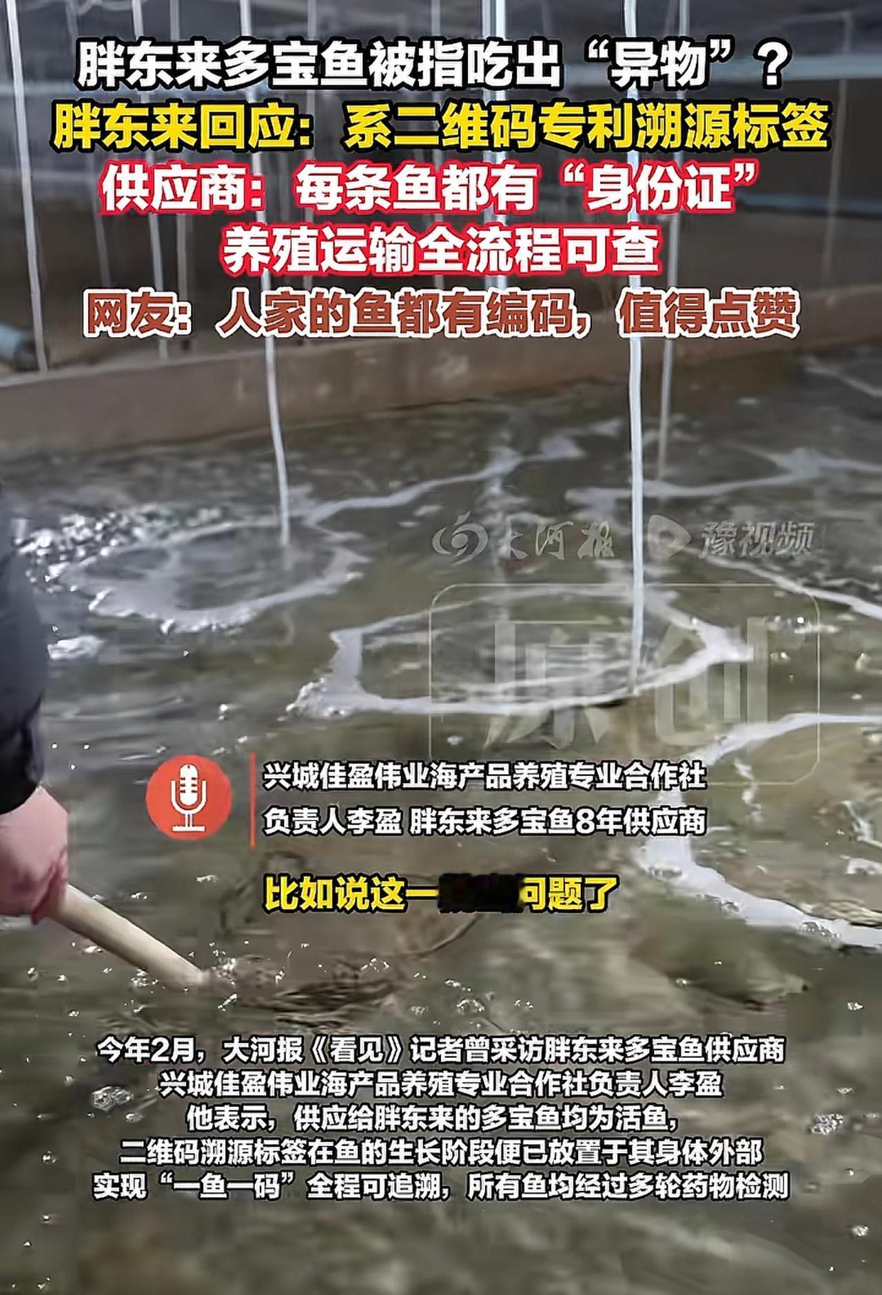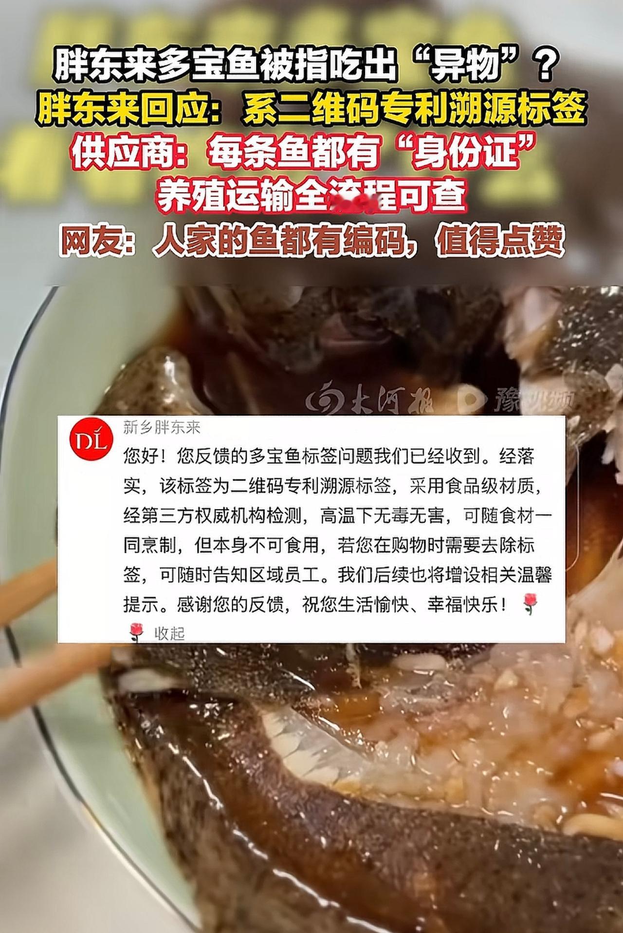 胖东来买的多宝鱼,竟然吃出“异物”,鱼肚子里有标签,看看胖东来和供应商的回答。首先胖东来客服回复,二维码是鱼的身份证,可以查到所有信息,而且标签是食品级但是不能食用。其次,供应商回答,胖东来质检会比市场更加严格,在原来6条标准基础上,再多出4条标准,而且一项不合格,立即终止该供应商所有合作。这才是真正的品控,买的放心,吃的放心。胖东来质量严格审核