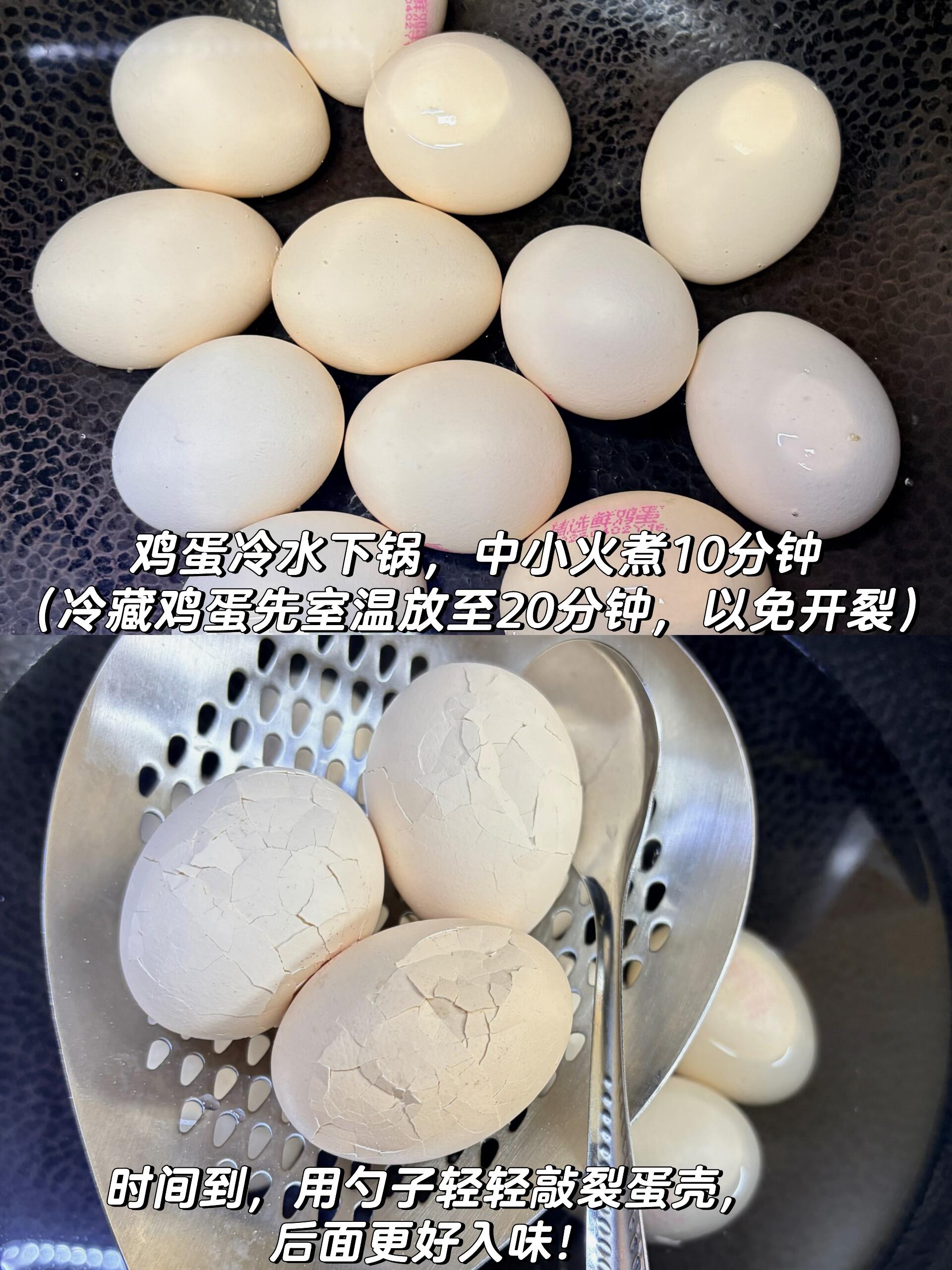 2️⃣ 煮好的鸡蛋捞出,用勺子背面轻轻敲,敲出细密的裂纹就可以,别敲太碎啦,这样卤汁才能慢慢渗透,每一口都入味!