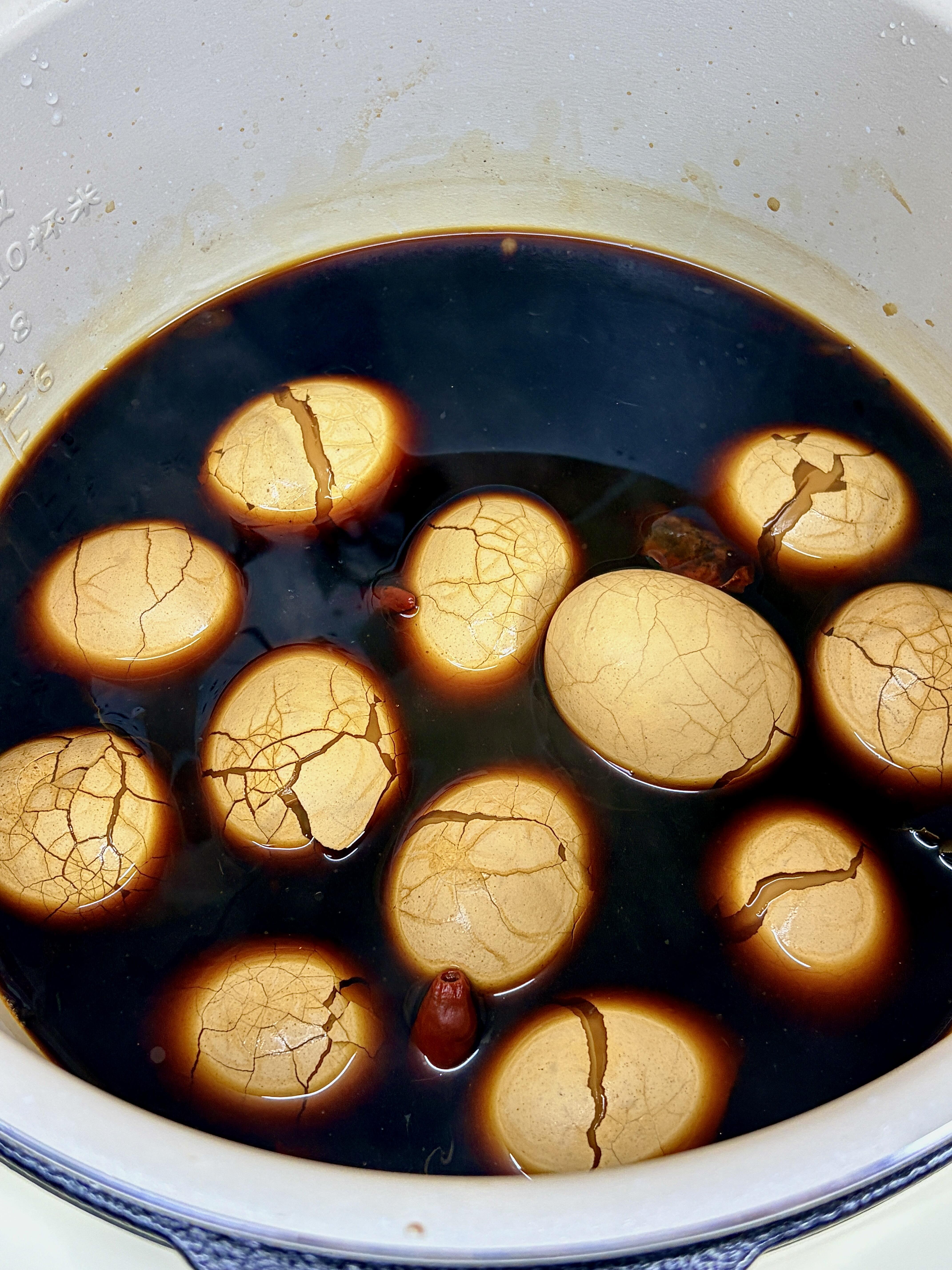 4️⃣ 把敲好裂纹的鸡蛋放进电饭锅,倒入调好的卤汁,确保卤汁能没过鸡蛋,按下煮饭键,焖煮1小时以上,卤味才能充分渗进鸡蛋里;偷偷说一句,冷藏一晚再吃,味道直接翻倍,香到上头!