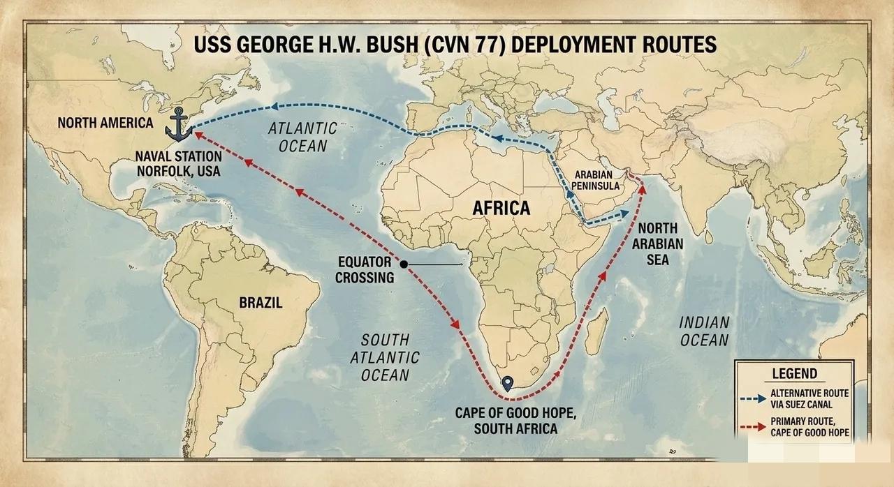 美国官员证实,“布什”号航母战斗群为避开也门胡塞武装控制的红海及曼德海峡,被迫绕行非洲好望角前往中东。这一调整使其总航程达到约21000公里,比传统的苏伊士运河航线多出近6500公里。