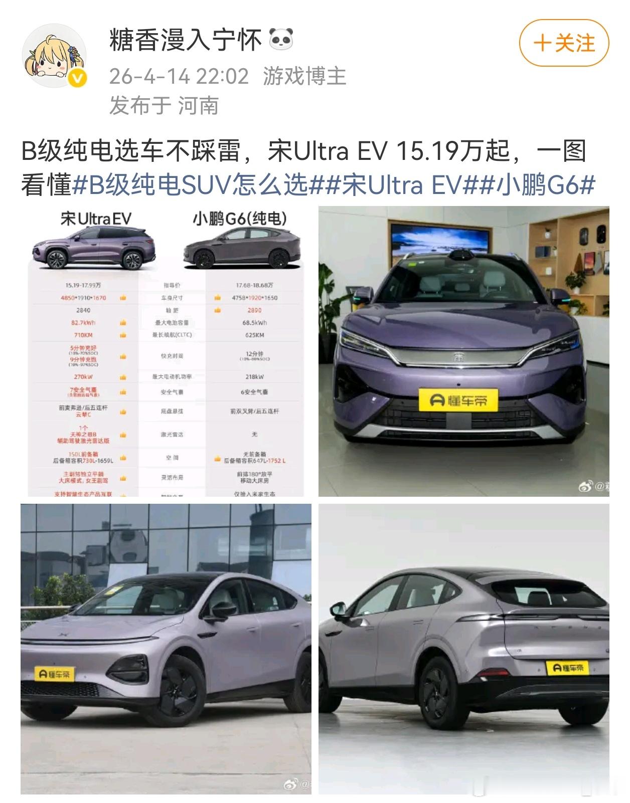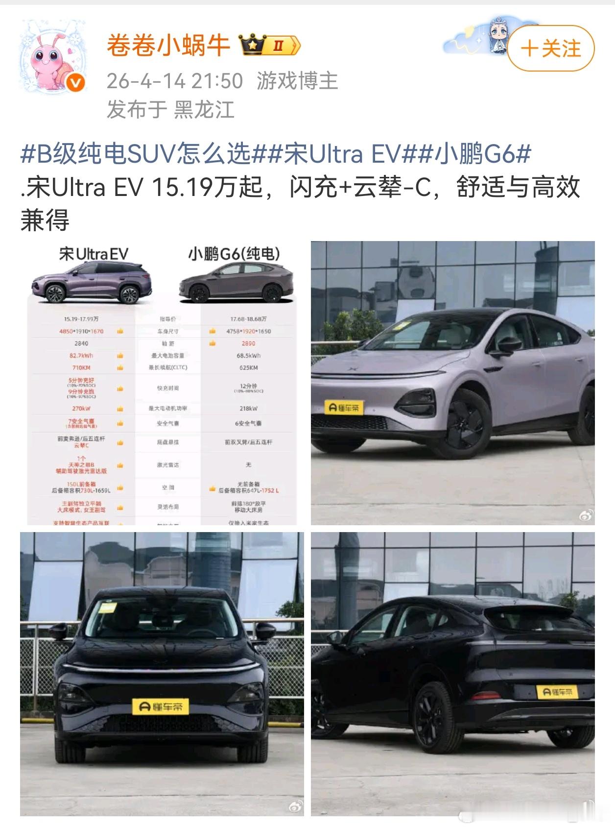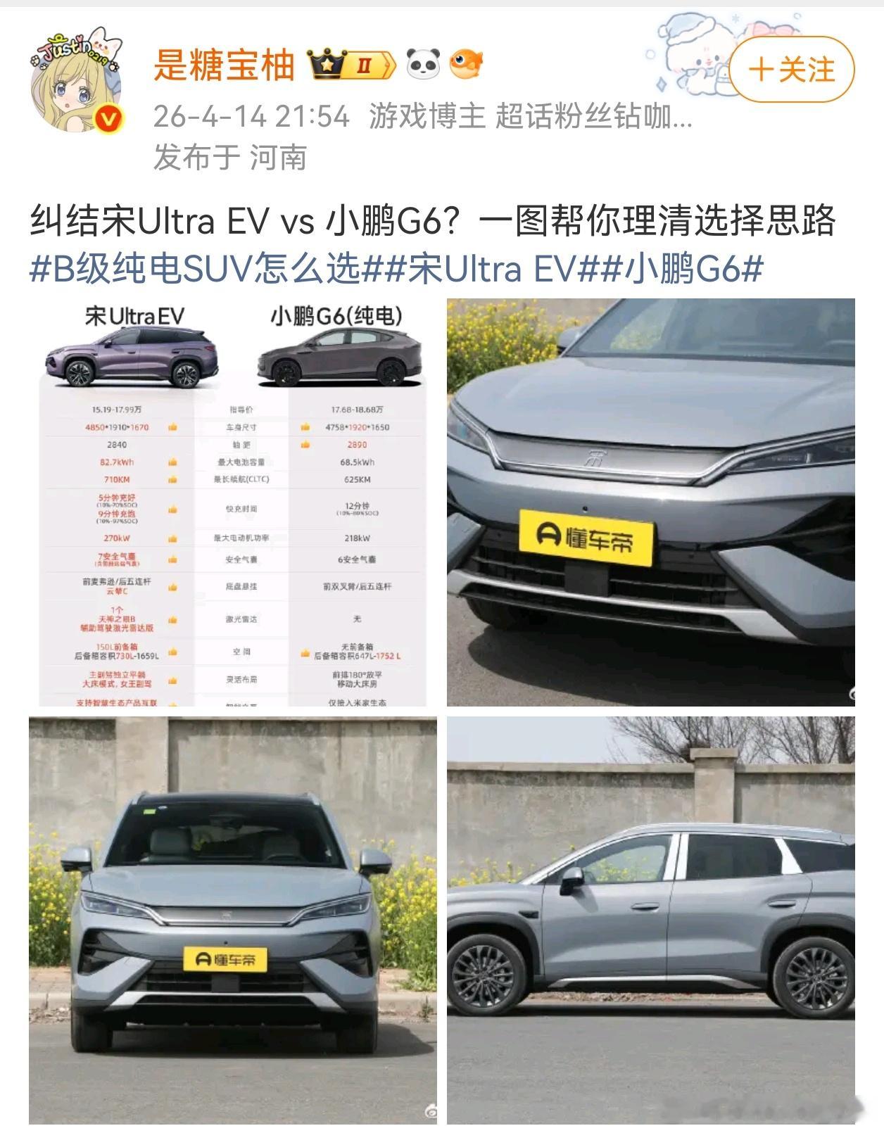 很多博主都在发,宋Ultra EV对比小鹏G6,奇怪。