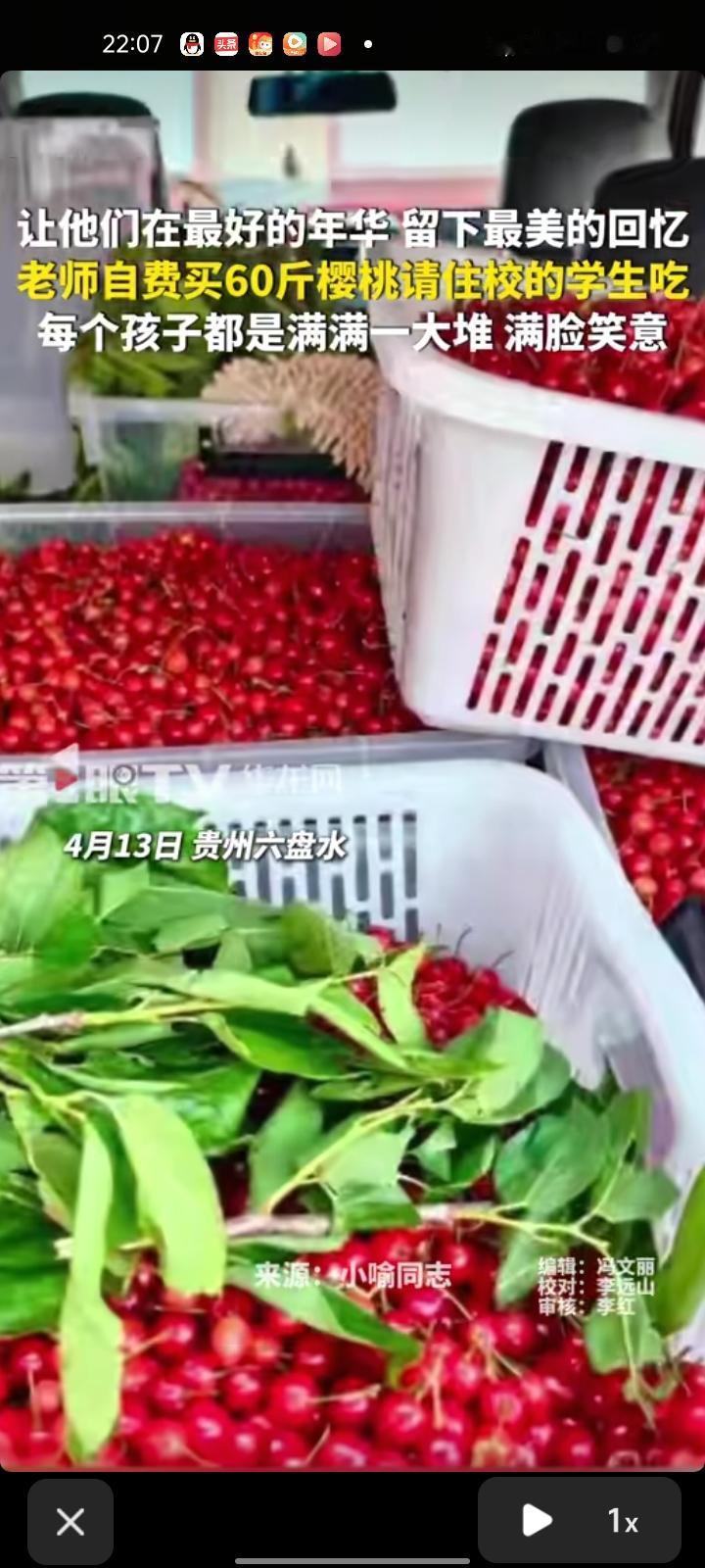 4月12日,贵州六盘水。樱桃上市了,学生们住校没能及时吃上,老师自费购买60斤樱桃请学生们吃,每个学生都是满满一堆,满脸笑意。当事老师称,我的学生我来宠,希望他们在最好的年华里留下最美好的回忆。