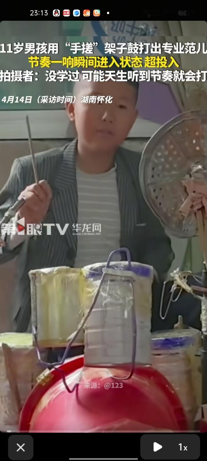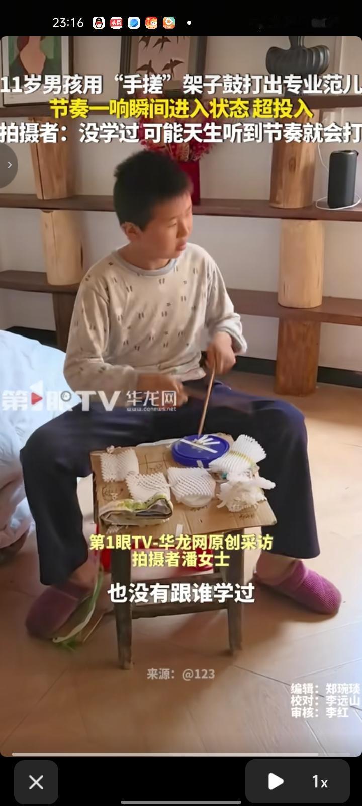 拍摄者称,孩子还在学校读书,他就是看到手机上有人在打鼓,觉得很喜欢,然后就是自己手动倒腾这个东西,也没钱去买这些东西,他就自己倒腾。他没跟谁学过,可能天生听到节奏就会打。