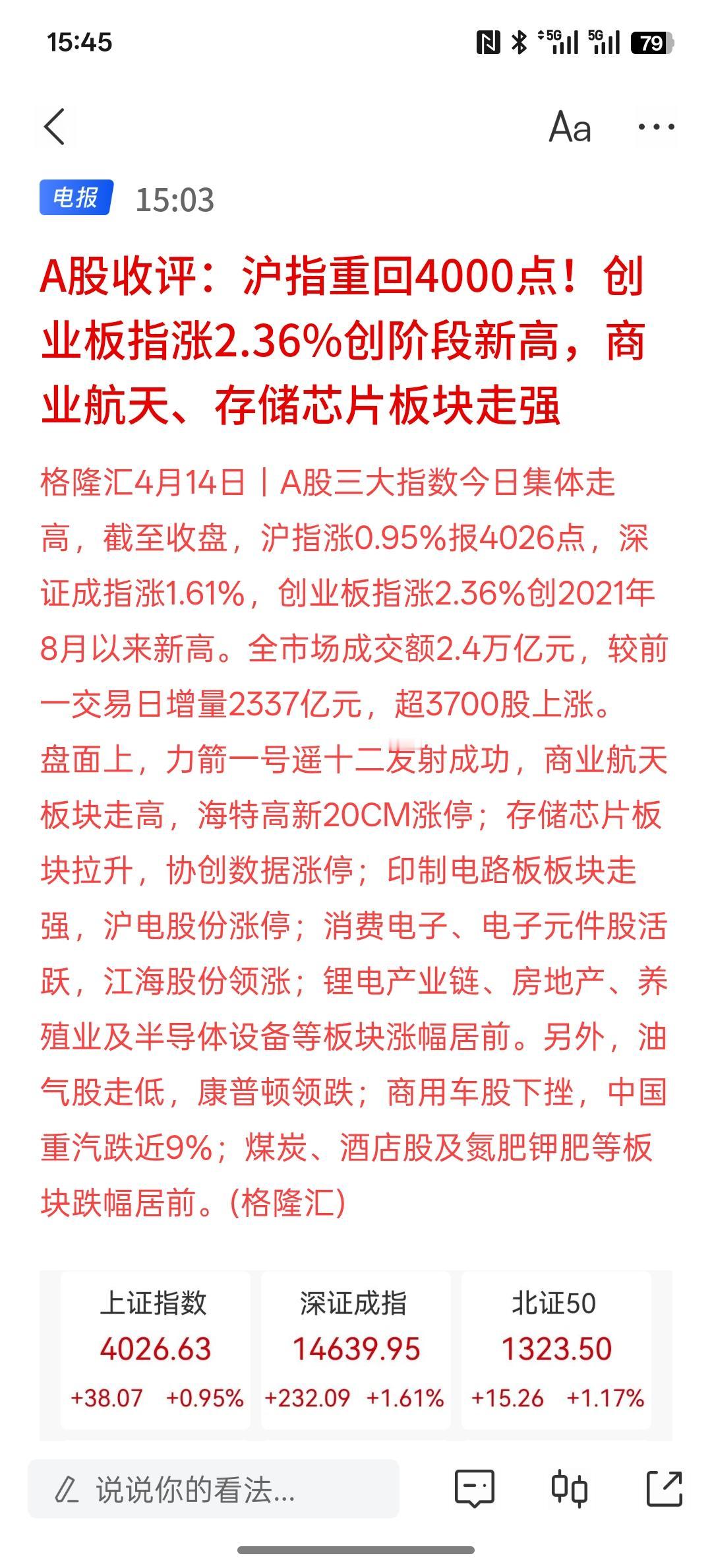 今天整个科技板块出现了大幅度的上涨,芯片,半导体板块涨幅靠前,创业板指数也是大涨2%点几,中午盘是有回落的趋势,下午盘又再次拉起,上证指数收盘站稳4000点上方!今天受外围消息影响,明天A股行情应该是一个好的走势,美国与伊朗依然在为下一次谈判做准备,双方之间也开始出现缓和的迹象。那么接下来第二轮谈判可能在本周或者下周的初期开始,有谈判的迹象!