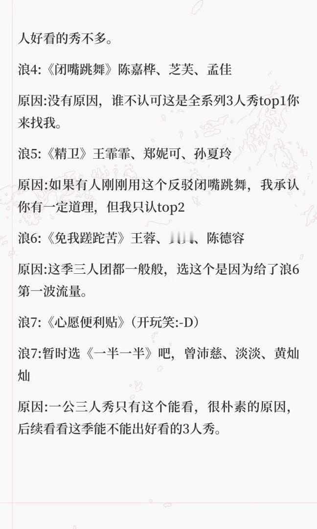 浪姐7季最佳三人秀舞台(个人向)浪1:《兰花草》宁静、阿朵、袁咏琳原因:浪姐开篇立意之作,定下了女性成长主题。浪2:《不屑完美》周笔畅,吉克隽逸,胡静原因:明明三个人三个颜色,却这么统一。浪3:《梦不落雨林》郑秀妍、李斯丹妮、王心凌原因:第三季2人秀和5人以上团秀精彩的多,反而3人好看的秀不多。浪4:《闭嘴跳舞》陈嘉桦、芝芙、孟佳原因:没有原因,谁不认可这是全系列3人秀top1你来找我。浪5:《精卫》王霏霏、郑妮可、孙夏玲原因:如果有人刚刚用这个反驳闭嘴跳舞,我承认你有一定道理,但我只认top2浪6:《免我蹉跎苦》王蓉、黄英、陈德容原因:这季三人团都一般般,选这个是因为给了浪6第一波流量。浪7:《心愿便利贴》(开玩笑:-D)浪7:暂时选《一半一半》吧,曾沛慈、淡淡、黄灿灿原因:一公三人秀只有这个能看,很朴素的原因,后续看看这季能不能出好看的3人秀。