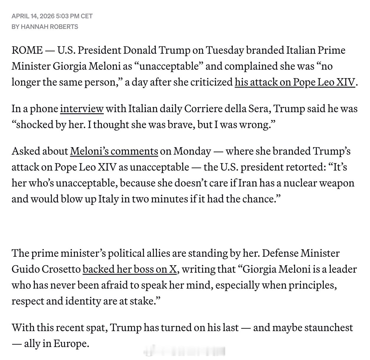 意大利总理梅洛尼日前批评川普攻击良十四世的言论“不可接受”,结果川普周二接受意大利采访时直接反击,称“真正不可接受的是她”,还抱怨她“已经不是原来的那个人”。川普甚至指责梅洛尼对伊朗核问题态度软弱,声称“如果伊朗有机会,两分钟内就能把意大利炸掉”。