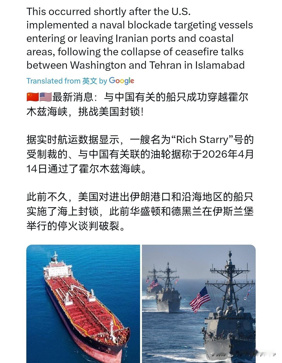 美国估计有点下不来台了!特朗普刚宣布封锁令,中国实控油轮 "璀璨富豪号" 通过霍尔木兹海峡!4 月 14 日,根据外媒报道,外媒称,根据实时航运数据显示,一艘受制裁、与中国有关的油轮 "璀璨富豪号" 已于 2026 年 4 月 14 日穿越霍尔木兹海峡。外媒表示,此次通行发生在美伊伊斯兰堡停火谈判破裂后不久。