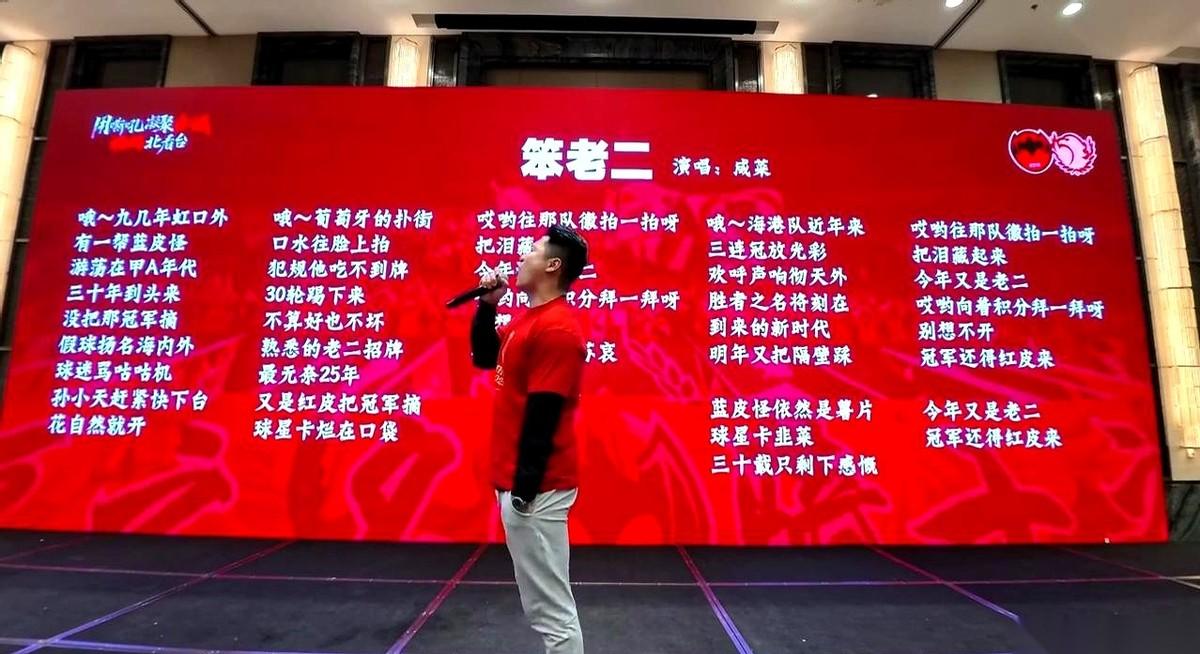 前脚还在台上,拿着麦克风,脸涨得通红,领着一帮人吼《笨老二》,指着对面申花球迷的方向。