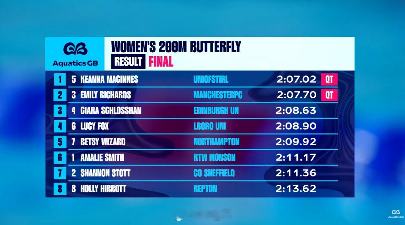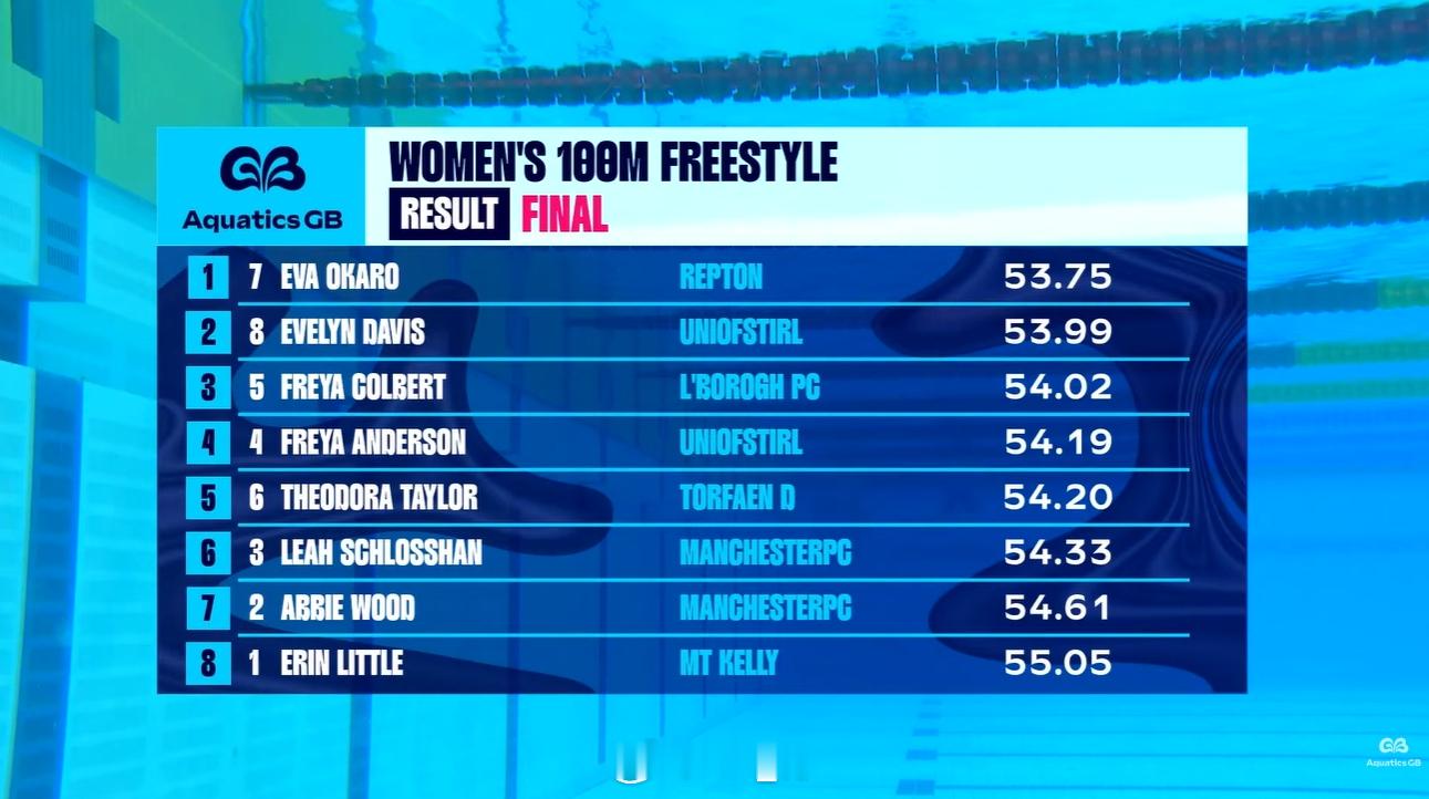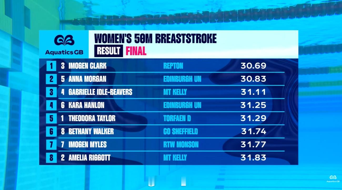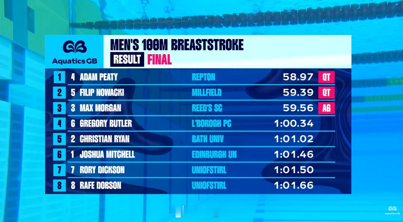 英国游泳锦标赛 第一天决赛男100蛙:Adam Peaty 58.97男400自:James Guy 3:44.04女100自:Eva Okaro 53.75女200蝶:Keanna MacInnes 2:07.02女50蛙:Imogen Clark 30.69