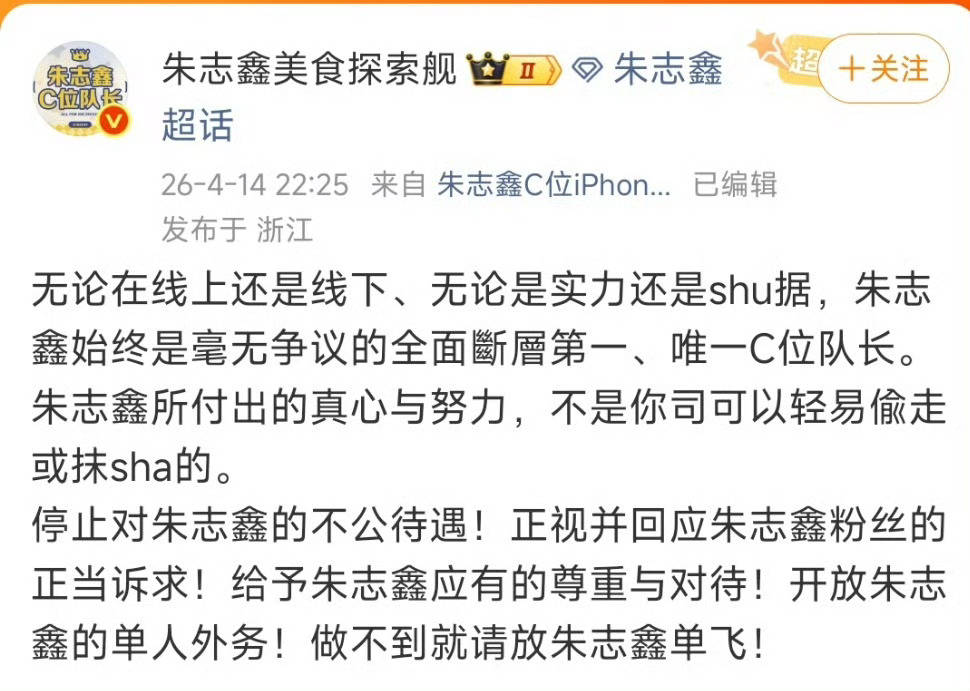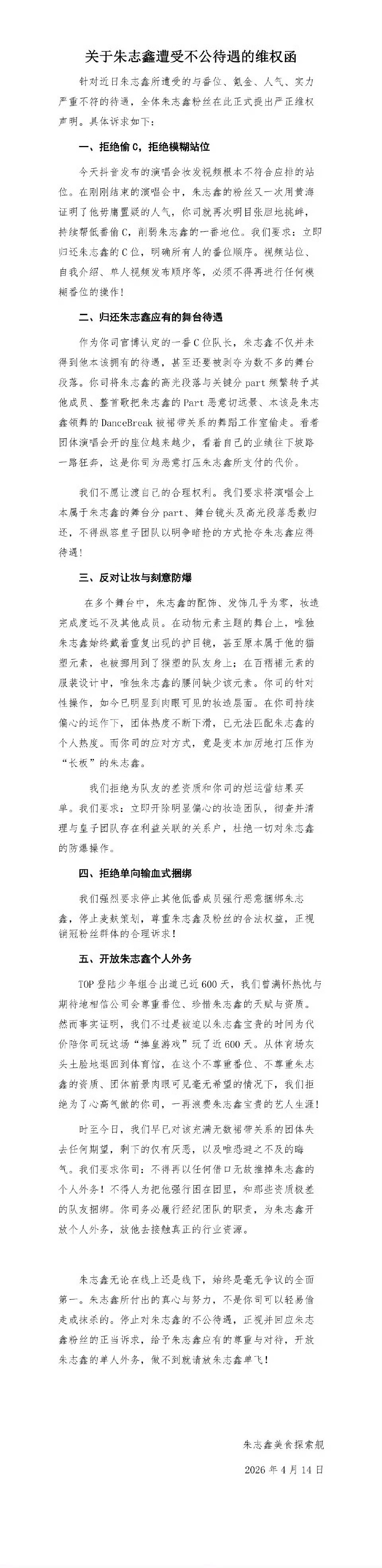 朱志鑫粉丝的维权函关于朱志鑫遭受不公待遇的维权函TOP登陆少年近期调整团体站位,引发热议不断,朱志鑫相关后援大站发布维权文书,质疑相关待遇分配存在不公情况