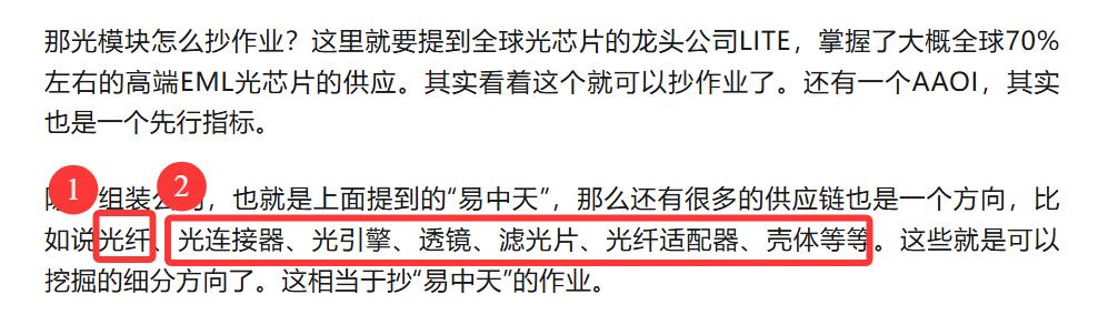 我这里举一个例子:光芯片,是光模块的核心 “心脏”。光芯片的作用是将光信号进行转换,主要安装在CPO内部,是整个CPO里面技术壁垒最高、价值占比最大的一部分。对应着光纤来看,是不是需求大增?是不是价格大涨?有哪些是底部龙头?