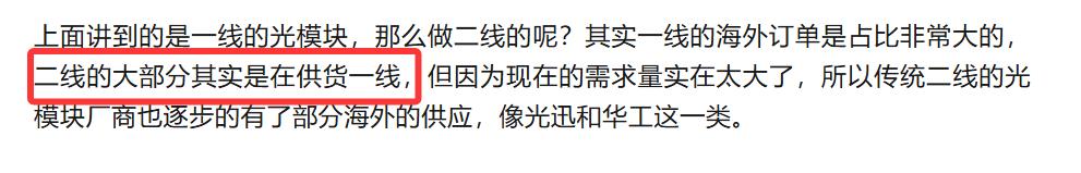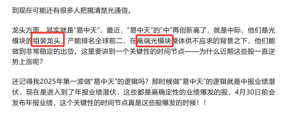 AI基建里面,每次上涨最先开始的就是CPO,CPO是最先兑现业绩的,现在整个光通信里面,高端光模块是最近期的,所以对应的就是“易中天”这一类的高端光模块组装龙头。