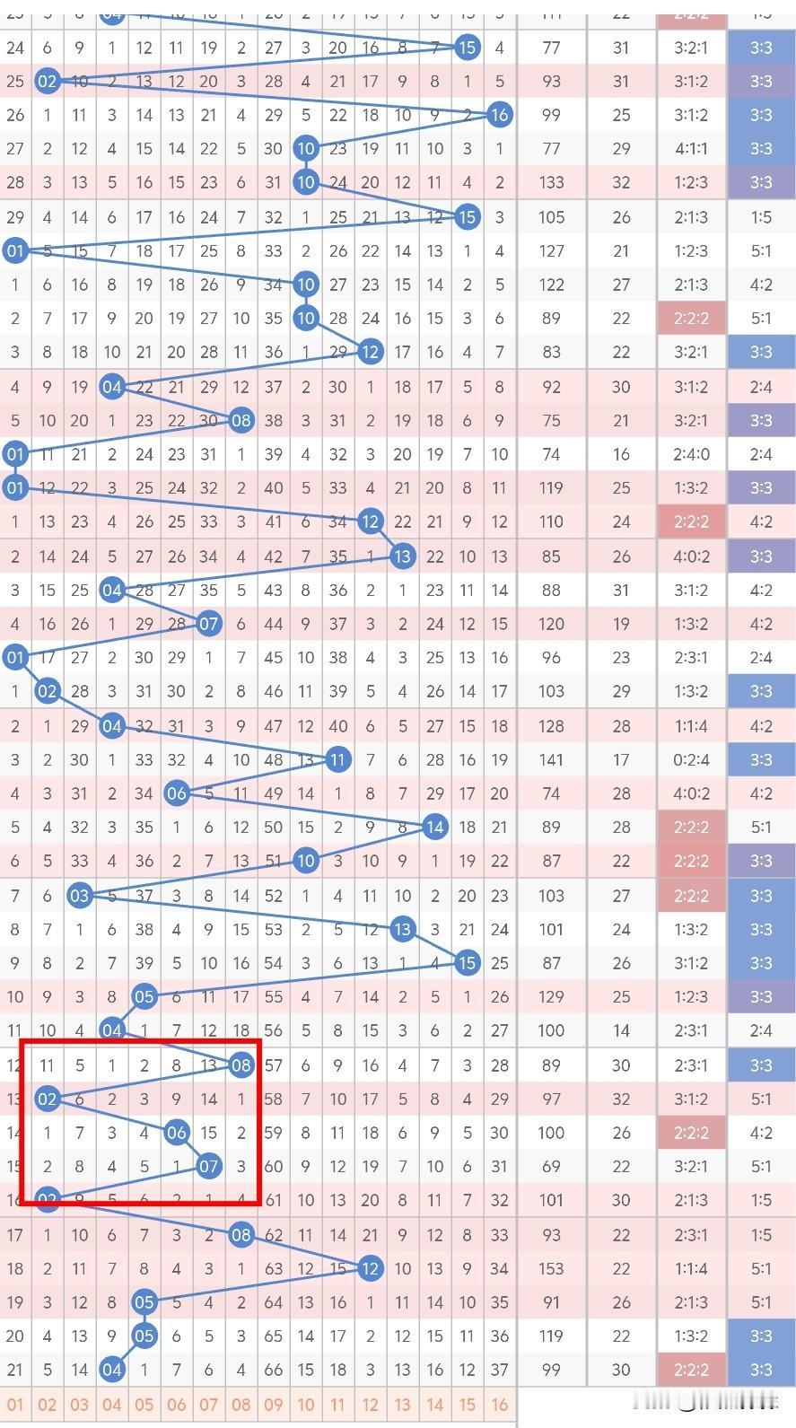 今晚的蓝球不考虑03、04、06、08、09,连续开出3期热码,这期不转变冷码,下期也必会出冷号,除了最小号01、02之外,就是最大跨度16,热码中02、05、06、07、08、12,除了02、12之外,其余都不考虑,遗漏值10以上03、10、11、13、14、15,除11、13之外,其余4码不看好,遗漏值20以上只有01,这个也是和走势中最相似号码,遗漏值30以上只有16,也是和上期号码相互较频繁的,最冷号09不考虑,还是考虑01、02、11、16。
