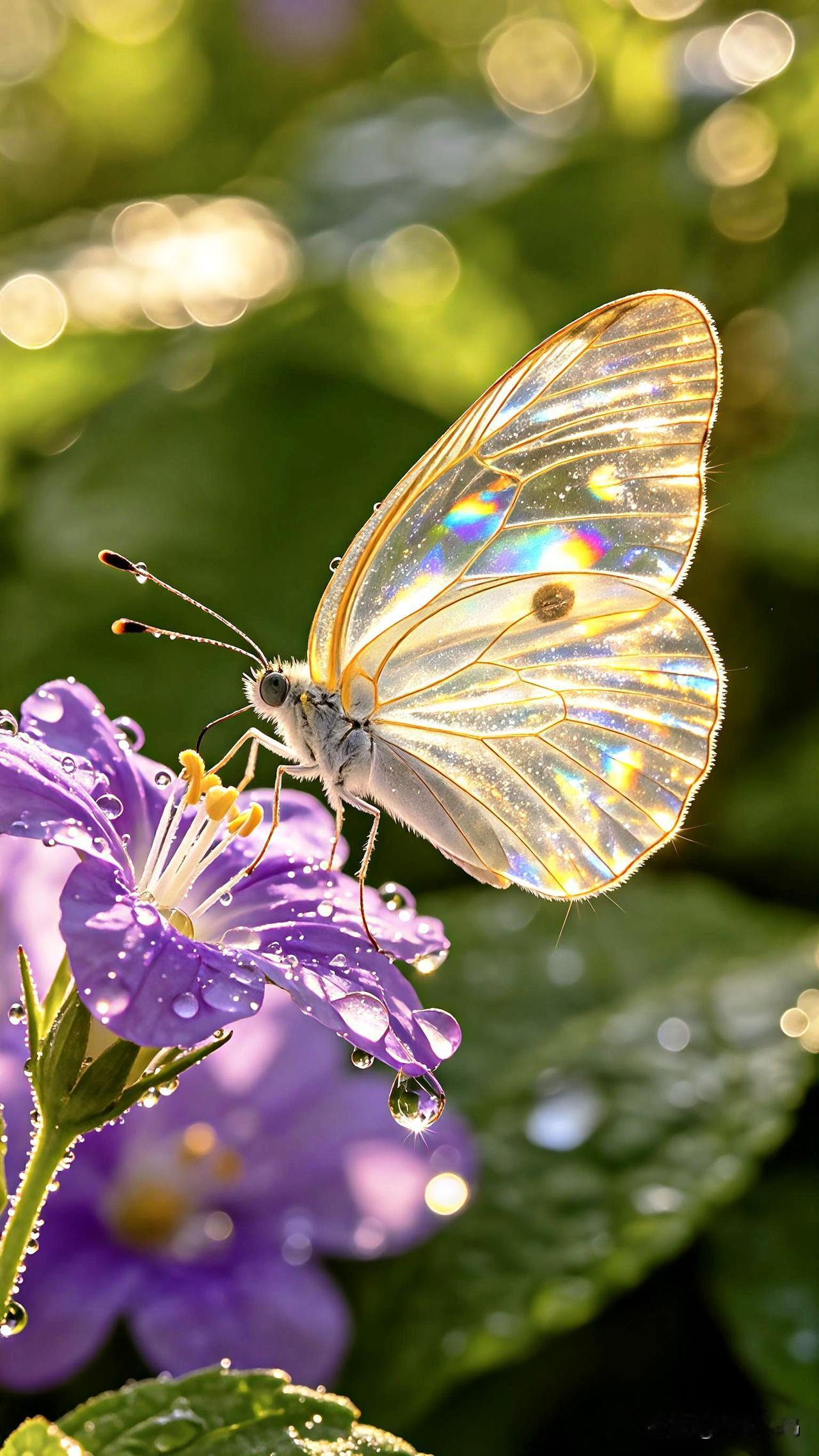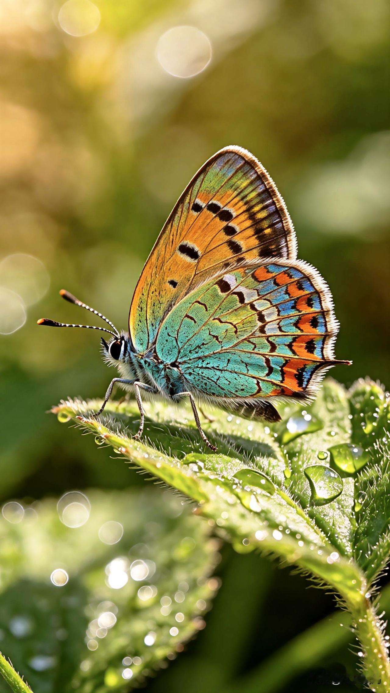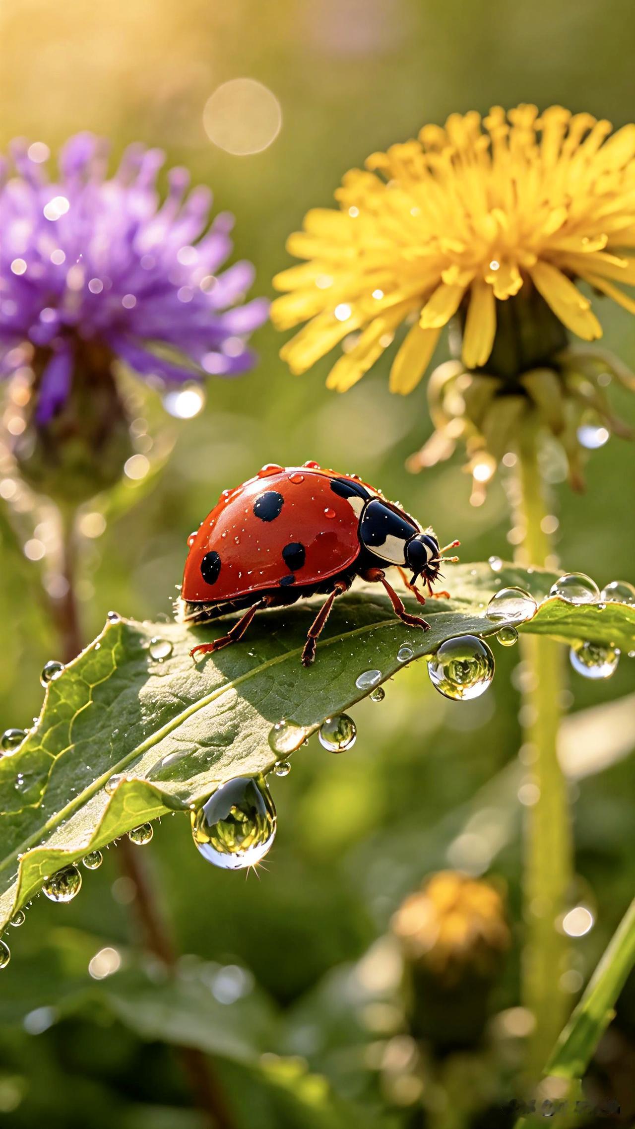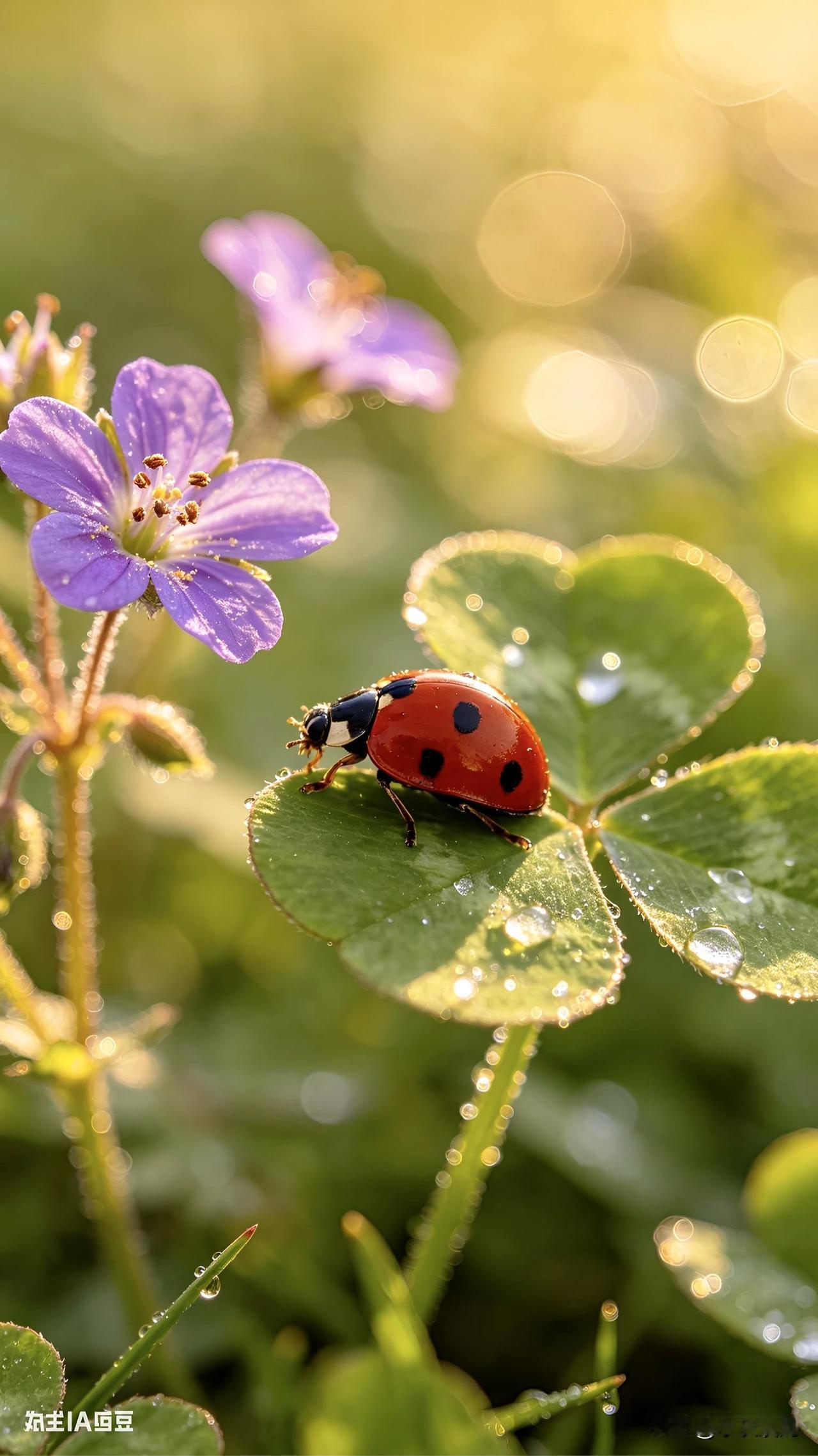 瓢虫、蜻蜓与蝶影,停在晶莹露珠缀满的绿叶上,在光影里温柔栖息。