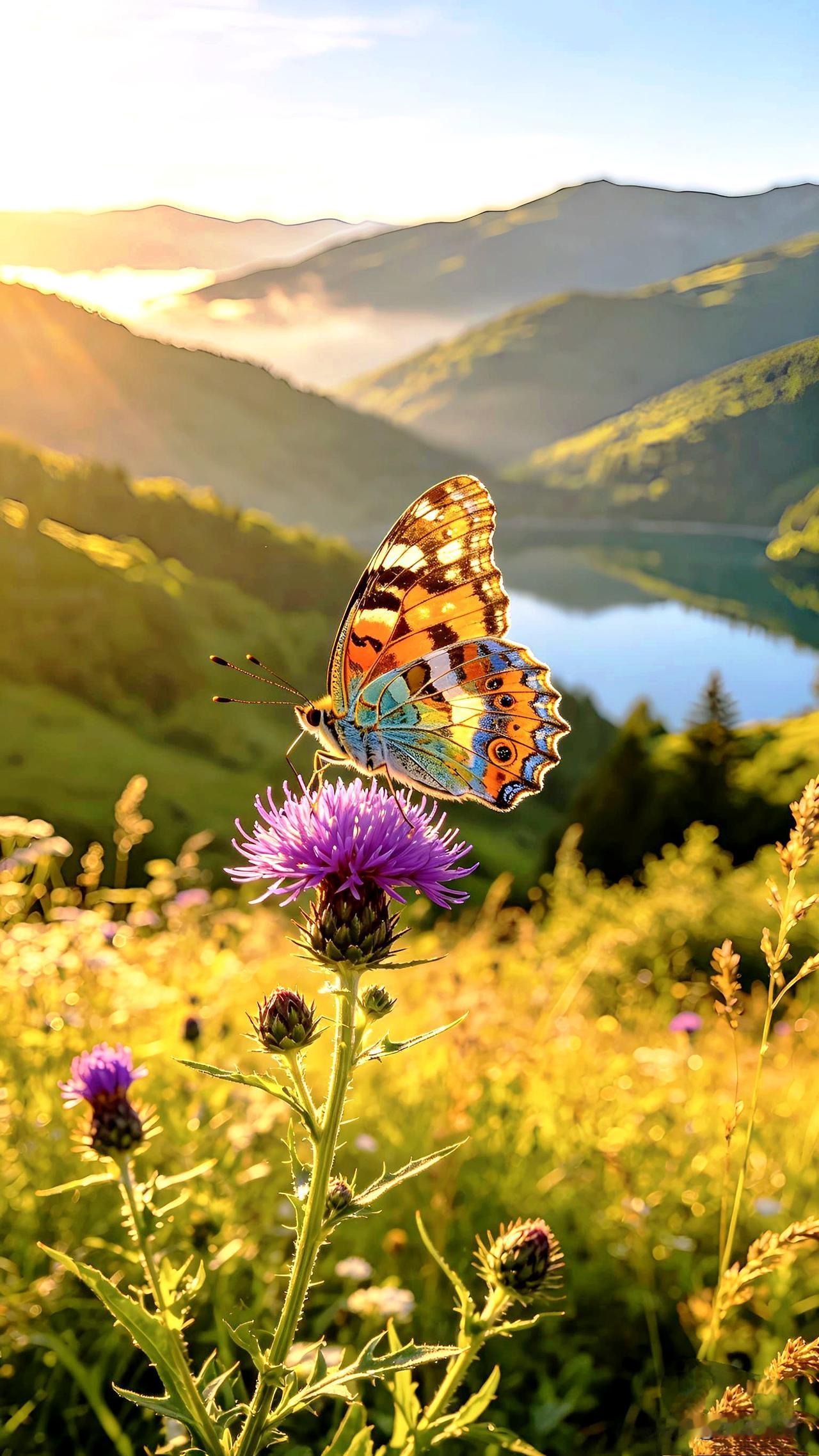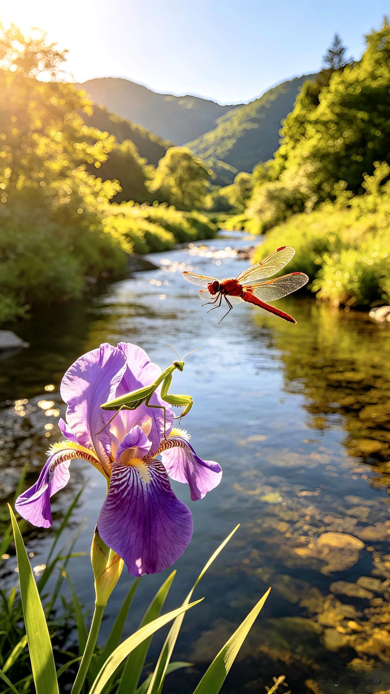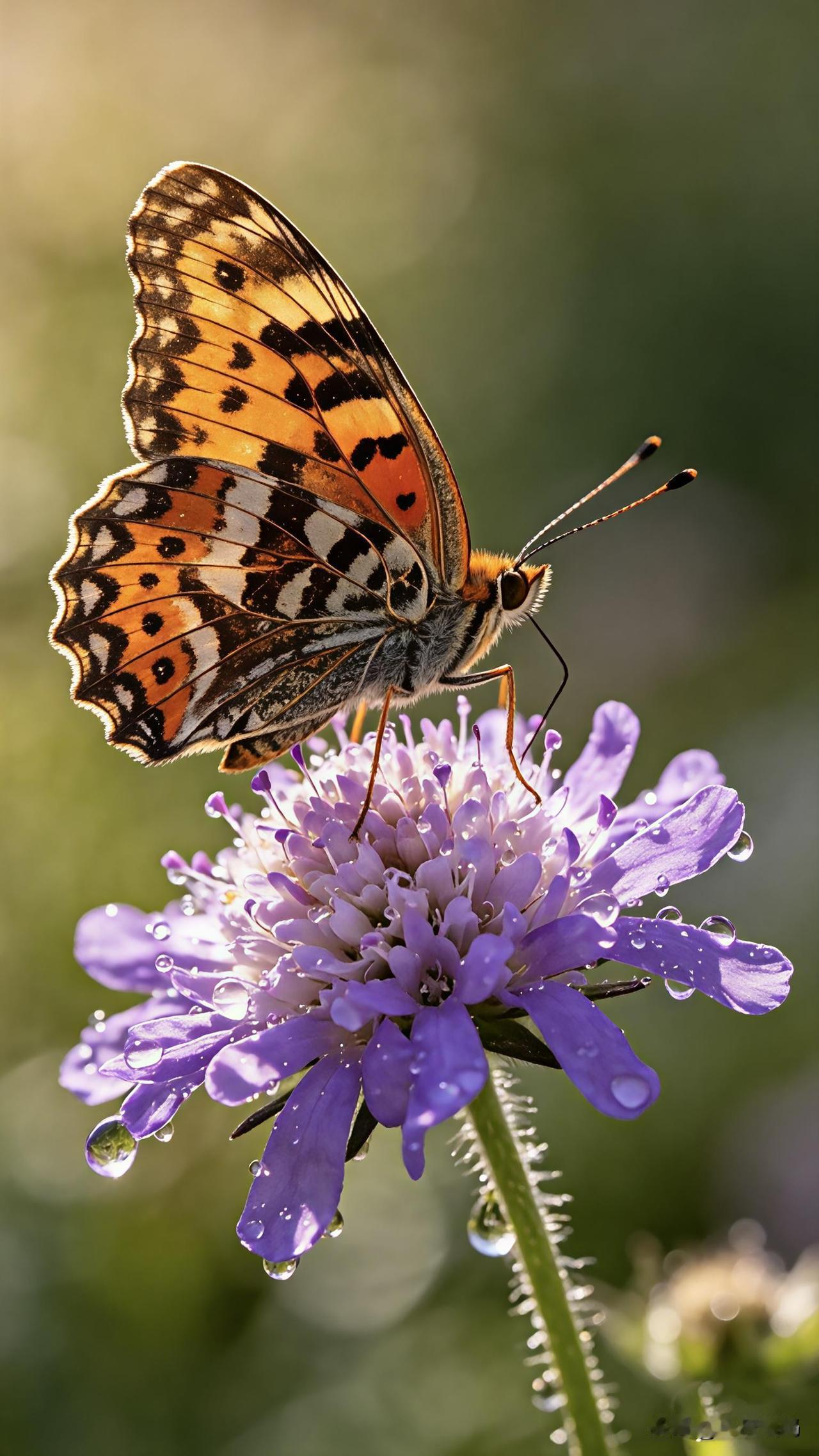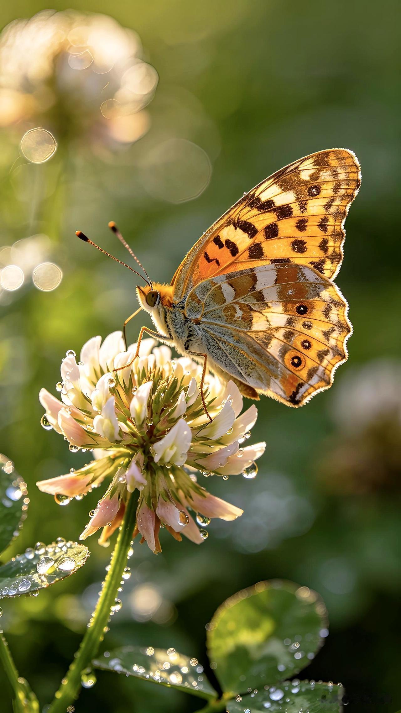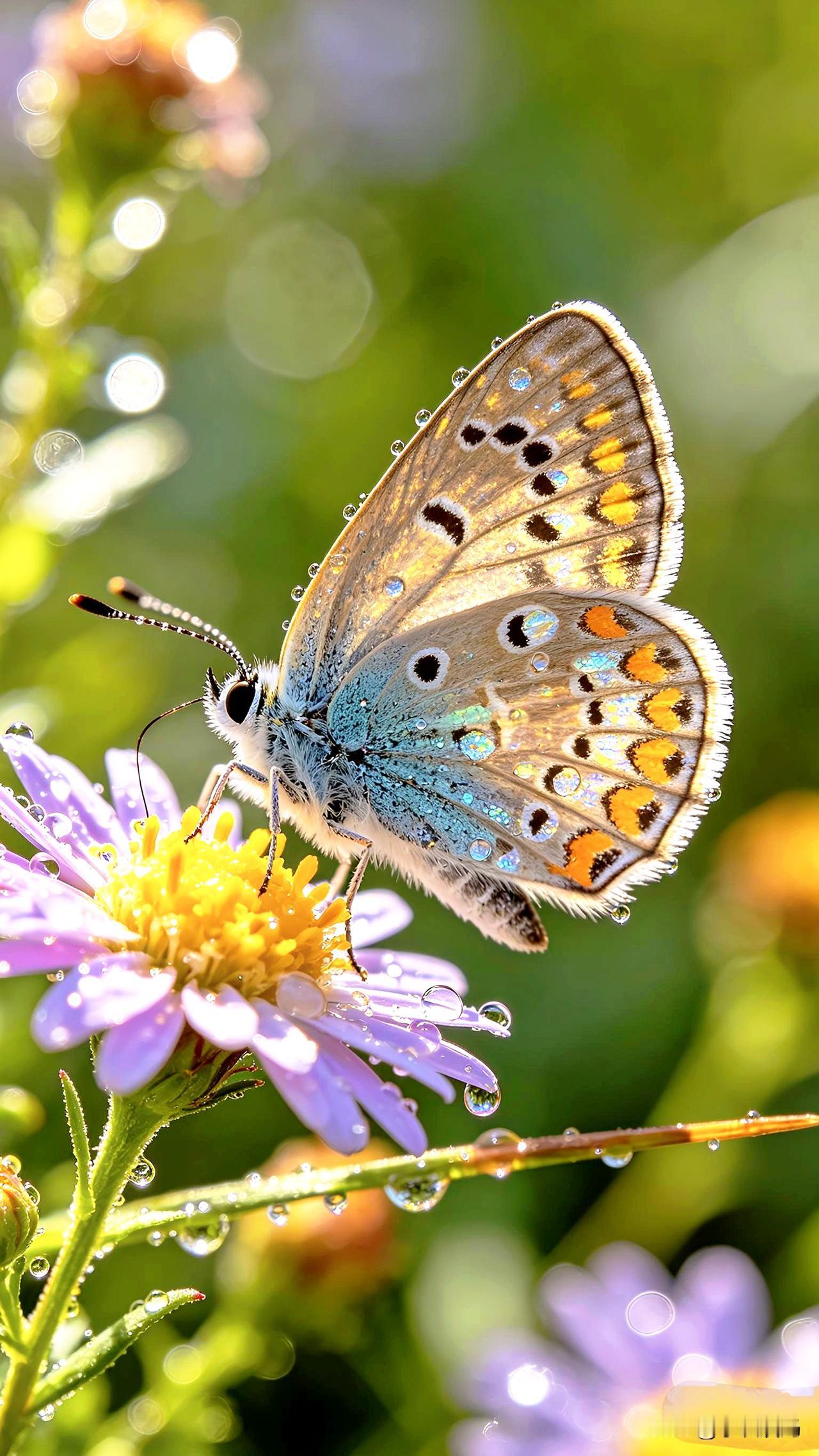瓢虫、蜻蜓与蝶影,停在晶莹露珠缀满的绿叶上,在光影里温柔栖息。