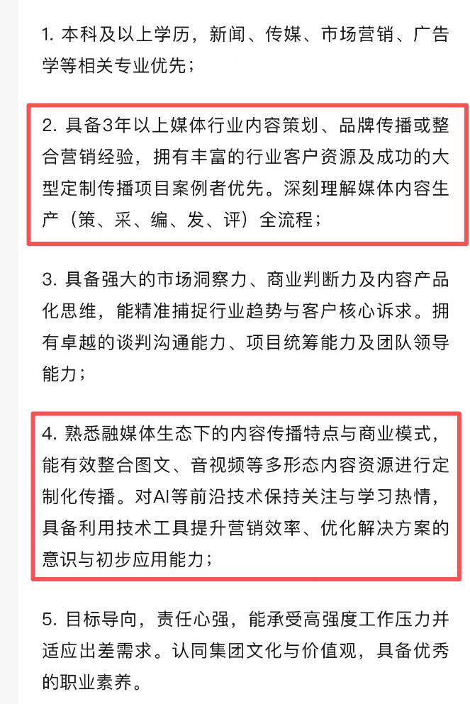 再看第二条。具备3年以上媒体行业内容策划、品牌传播或整合营销经验,拥有丰富的行业客户资源及成功的大型定制传播项目案例者优先。深刻理解媒体内容生产(策、采、编、发、评)全流程。