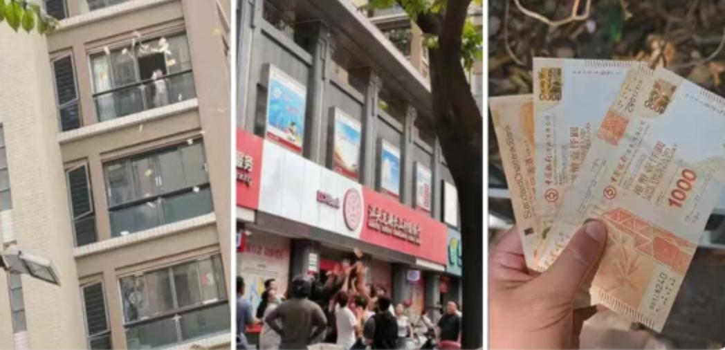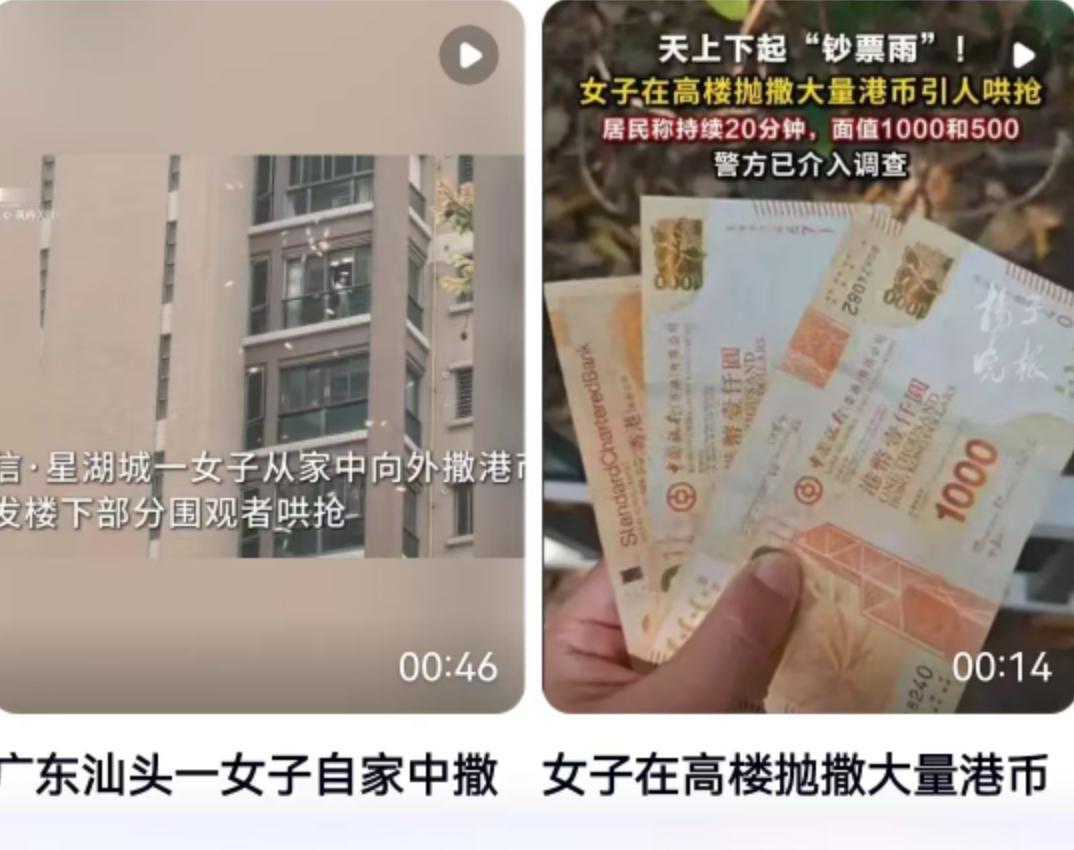 4月14日13时许,广东汕头星湖城小区邻街的一栋高层住宅楼上,突然下起了一阵不寻常的“钱雨”。大量面额不等的港币从阳台随风飘落,散落在小区内部和外面的街道上。据现场目击居民描述,这场奇特的抛撒行为持续了大约20分钟,天空中飞舞的纸币面值从500元到1000元不等。很快,这罕见的一幕引来了附近的居民和过路群众,人群纷纷涌上前去争抢,有人甚至在短时间内就捡到了一大把。