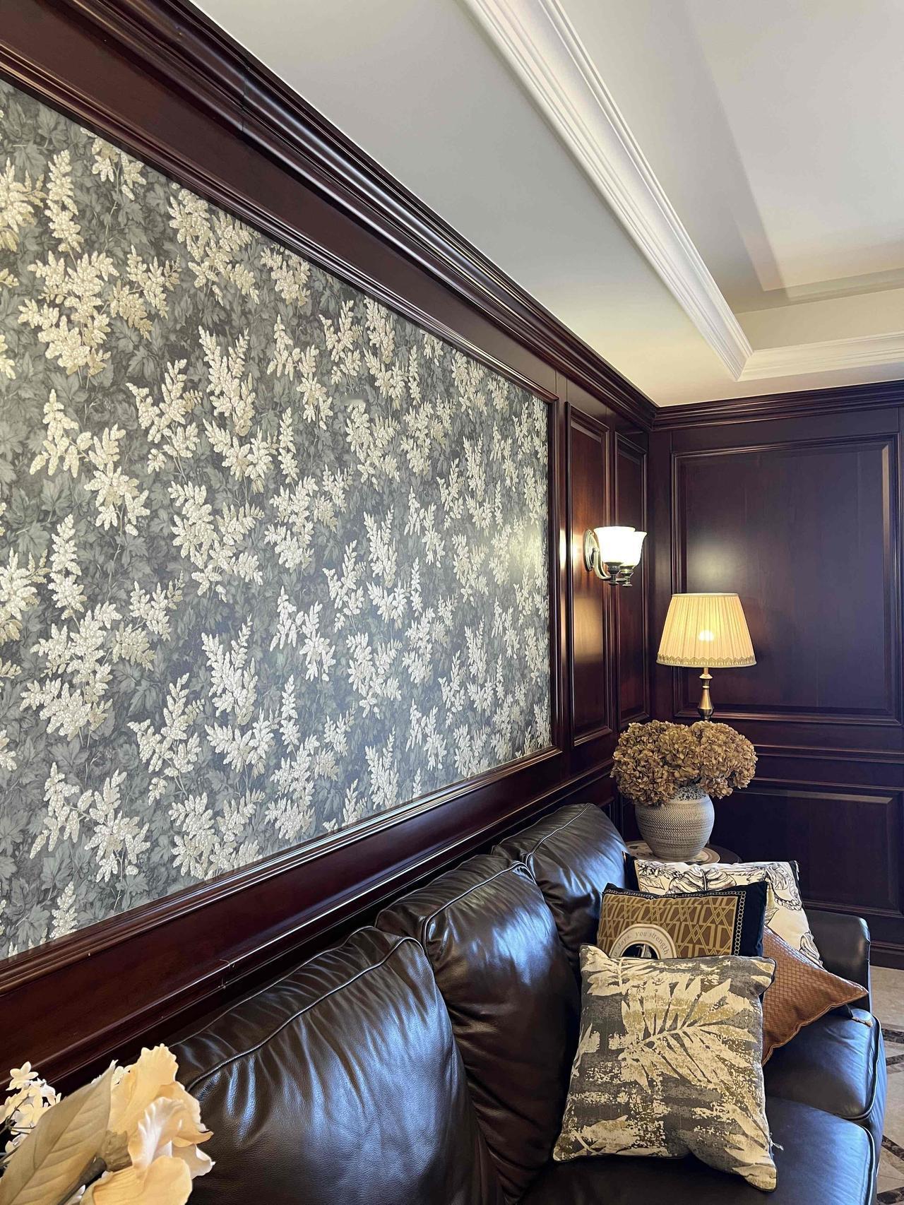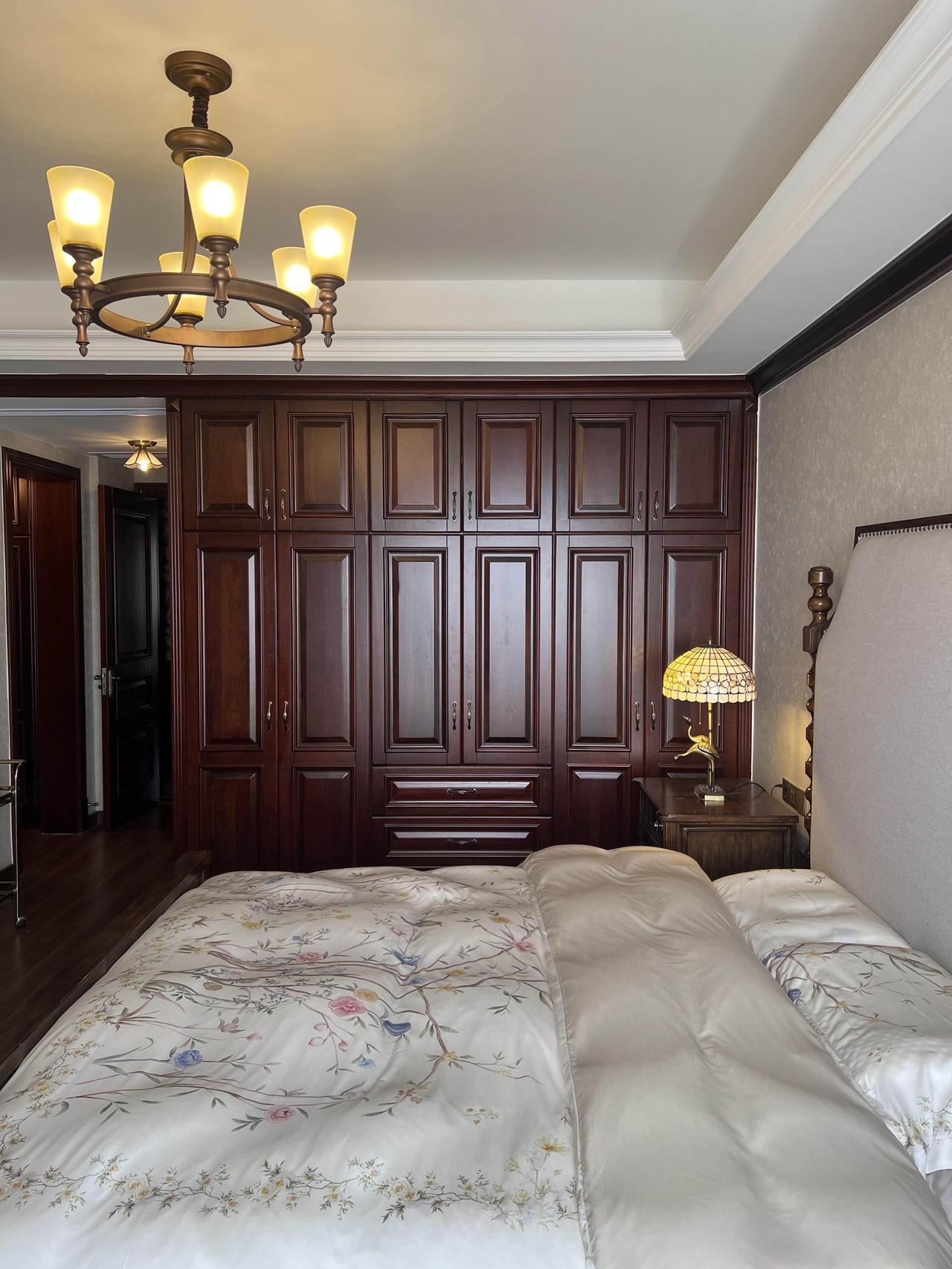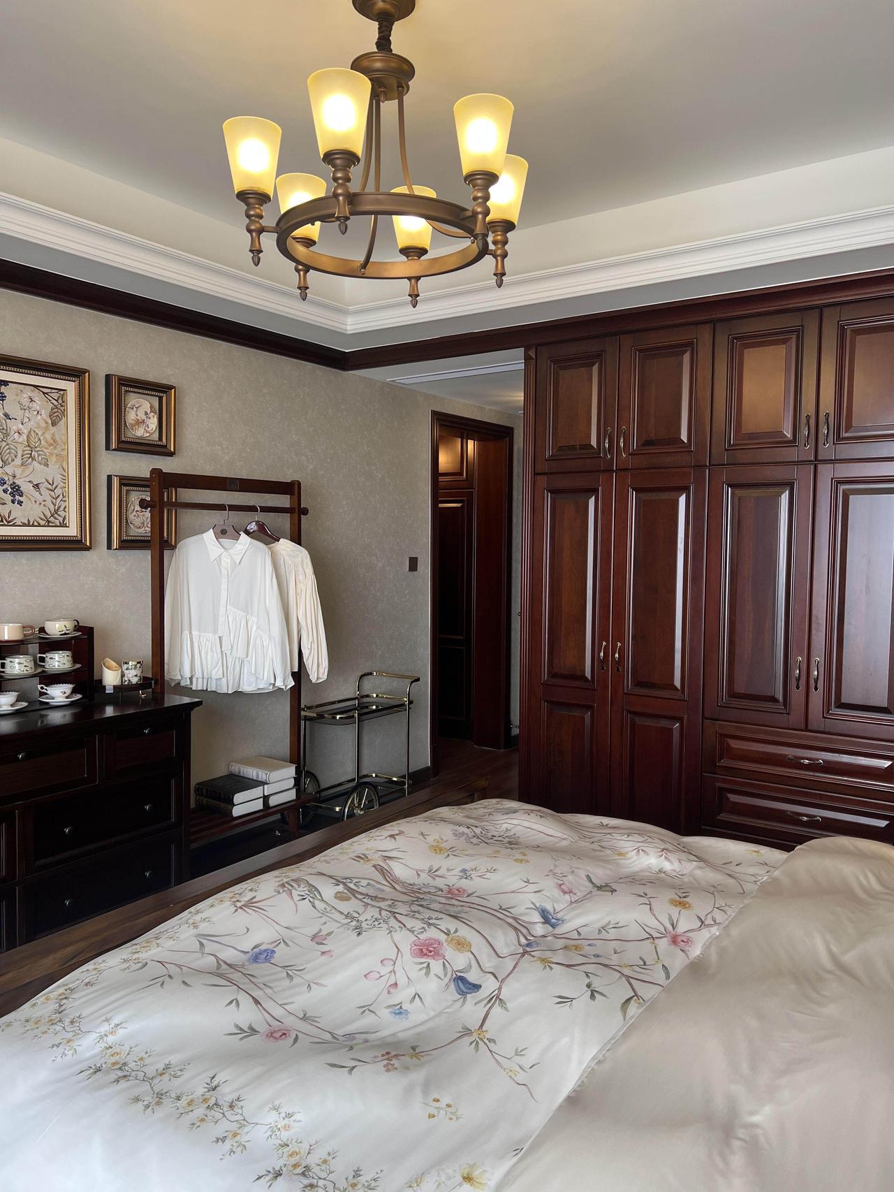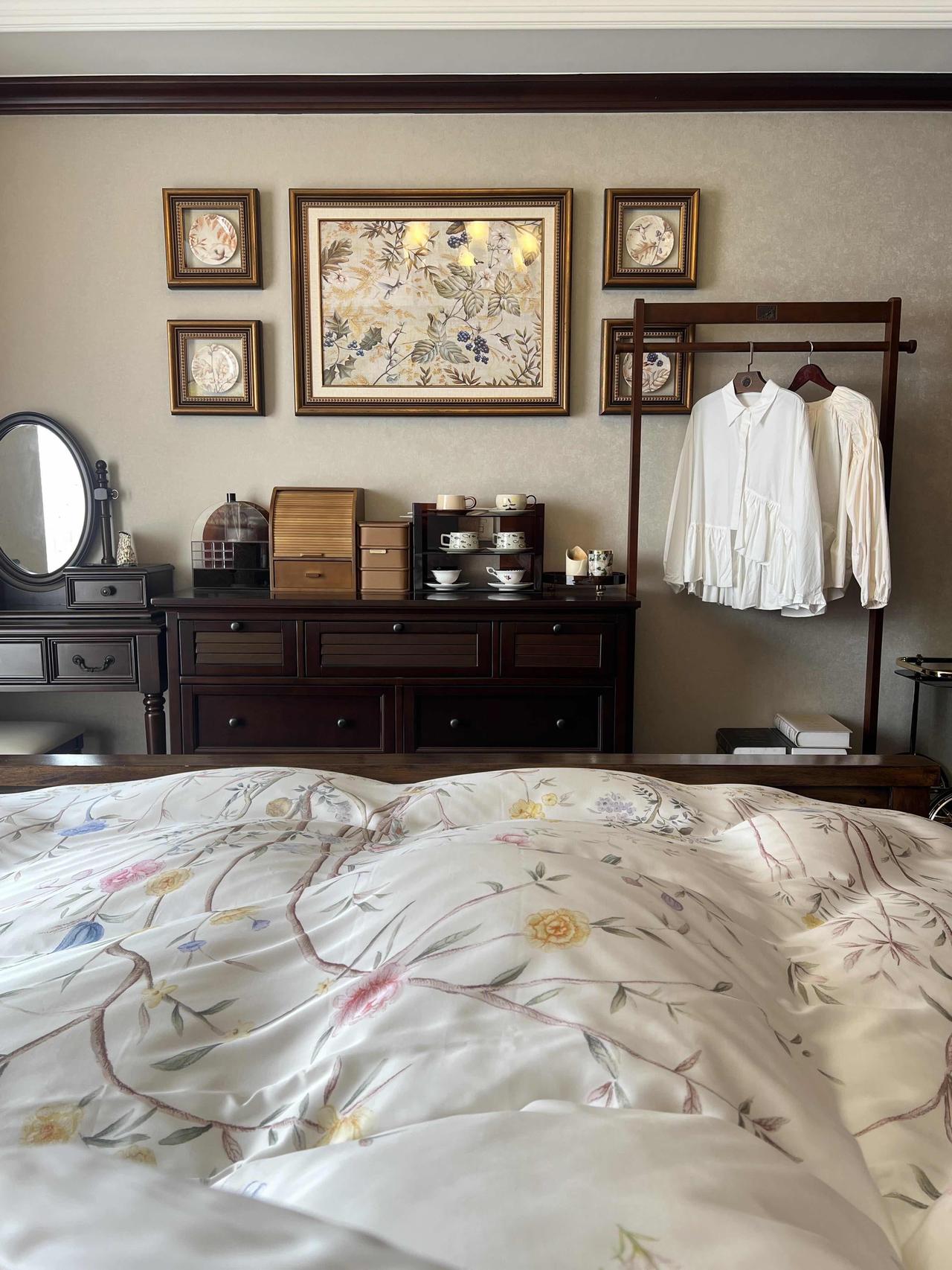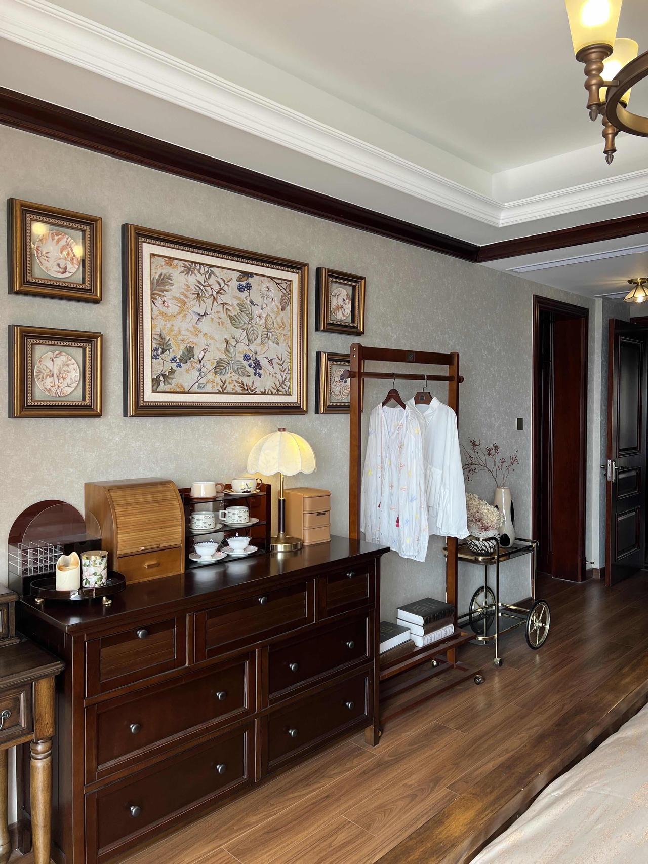结果证明,美式确实能吃透三代人的审美,红樱桃木色的家具,色调偏深,乍看有点暗沉,但配上暖色地板和青灰色的暗花墙布,整个空间既有质感又特别温暖,父母没有嫌它老气,孩子也没有觉得压抑。一家人各得其所。