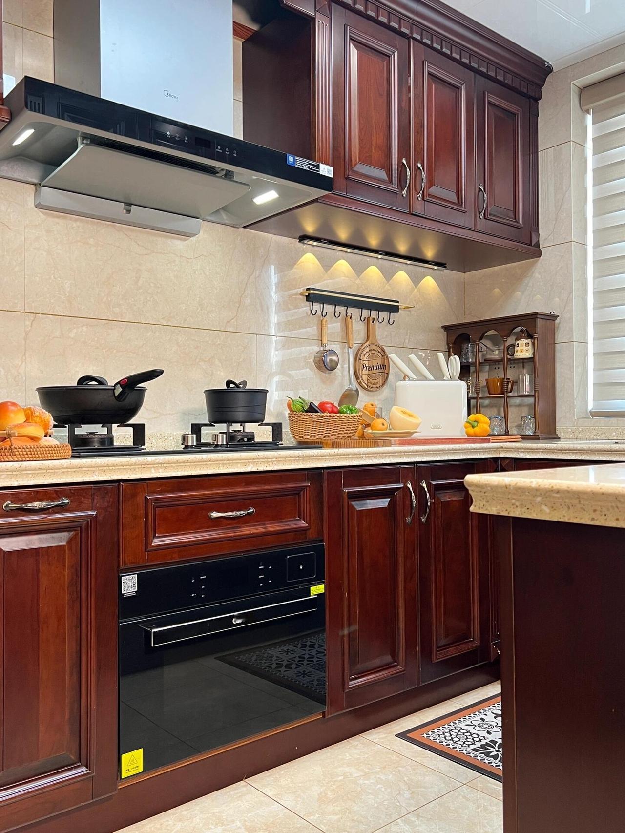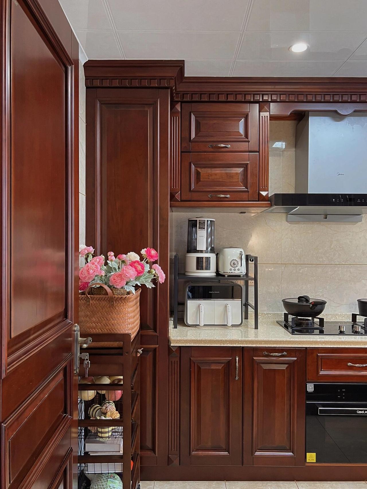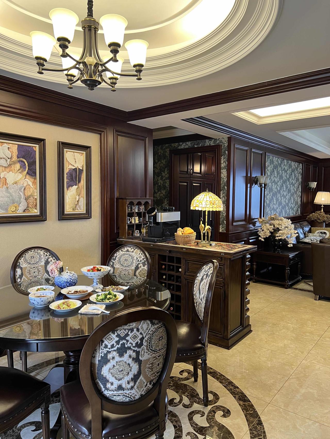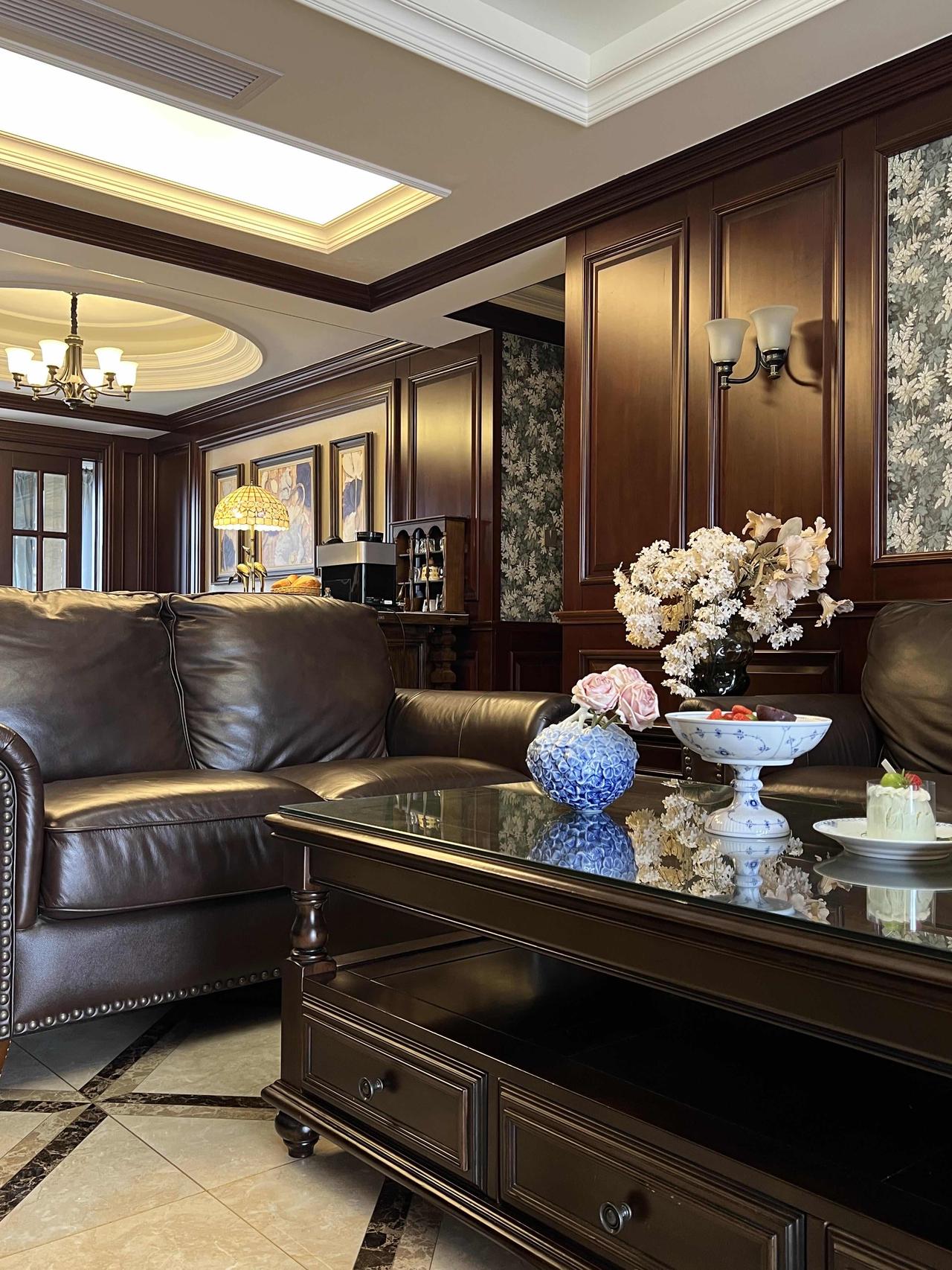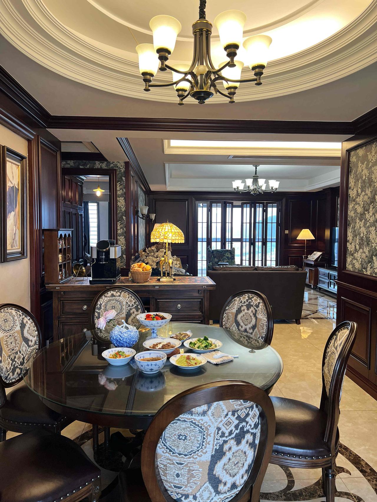结果证明,美式确实能吃透三代人的审美,红樱桃木色的家具,色调偏深,乍看有点暗沉,但配上暖色地板和青灰色的暗花墙布,整个空间既有质感又特别温暖,父母没有嫌它老气,孩子也没有觉得压抑。一家人各得其所。