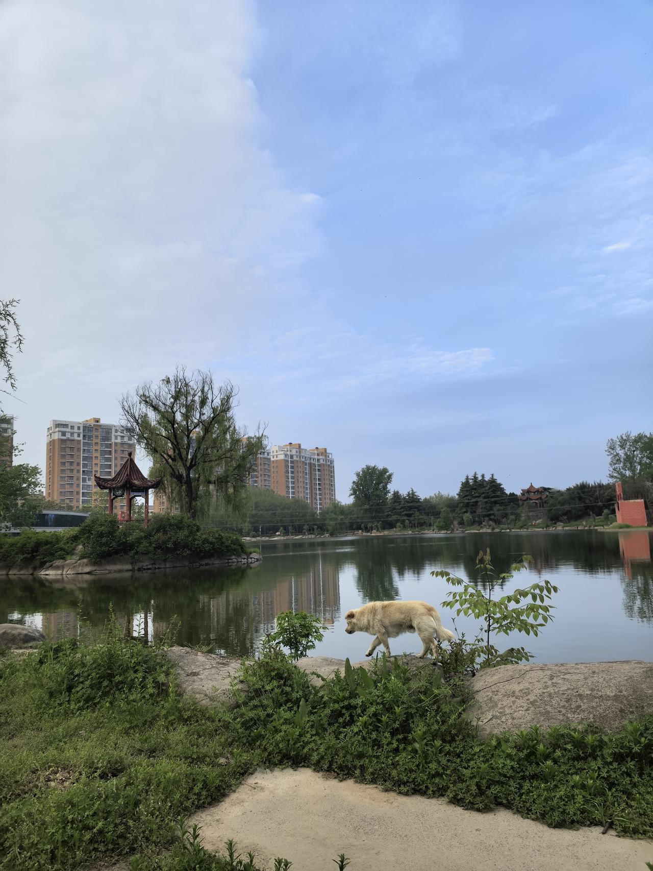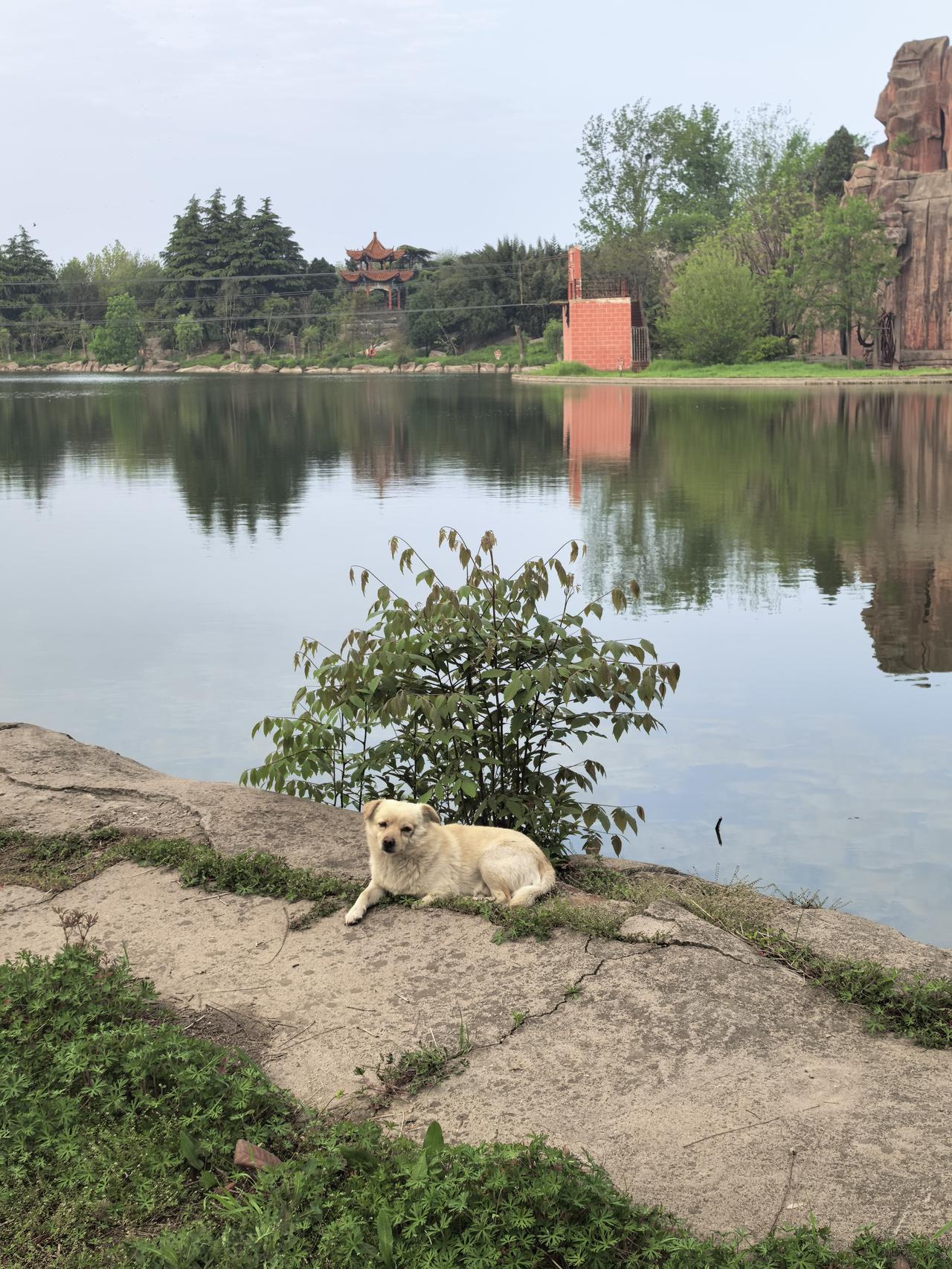 晨练结束,徜徉于鄢陵花博公园东湖湖畔。 一条小狗慵懒地卧在湖边,跟这旖旎春色完