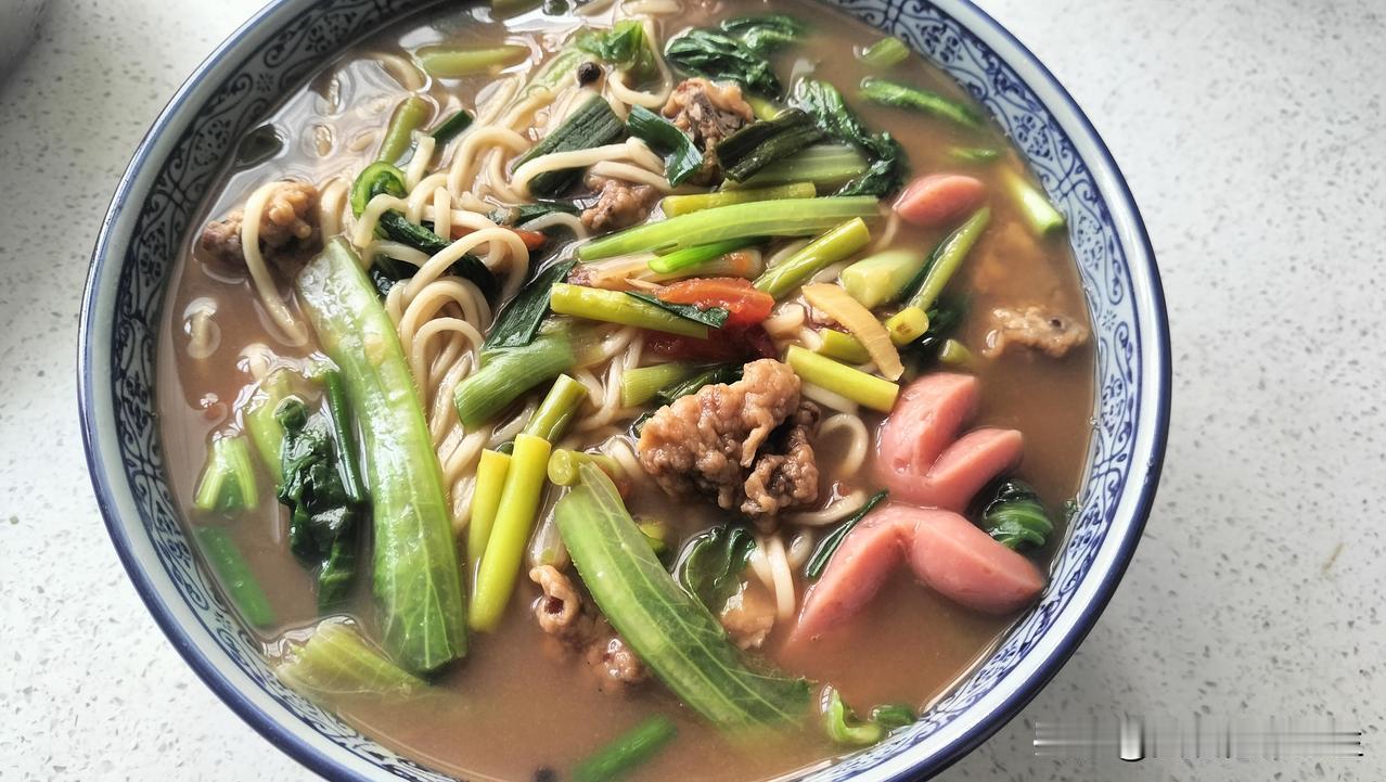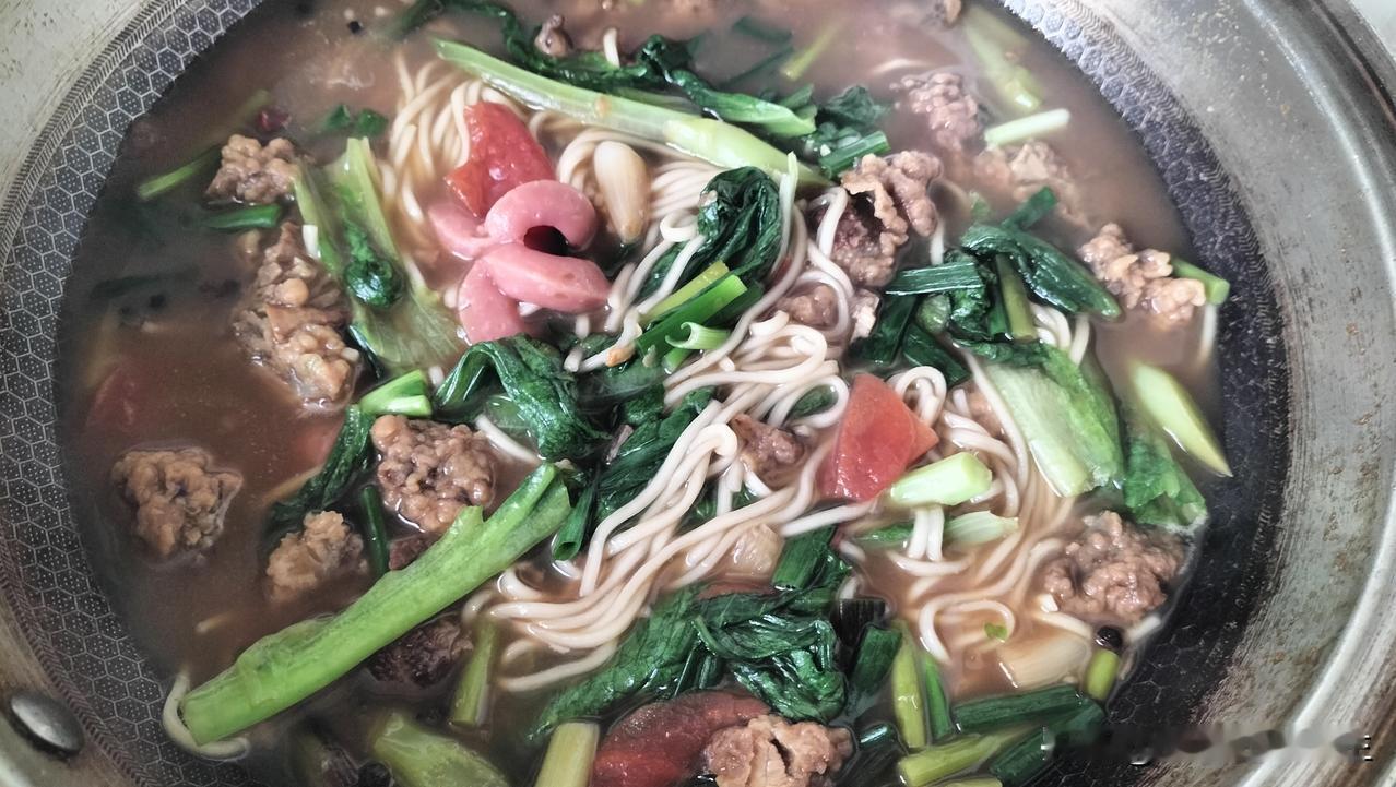 食材有鲜面条、西红柿、脆皮肠、生菜、葱、蒜苔、小葱、姜丝等。当然,还有我自己炸制的肉丸,放锅里一些,更好吃。