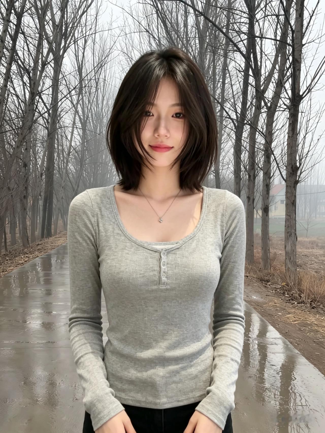 灰衫轻裹一身柔,秀发如云绕额头。 烟火人间多意趣,一颦一笑度春秋。