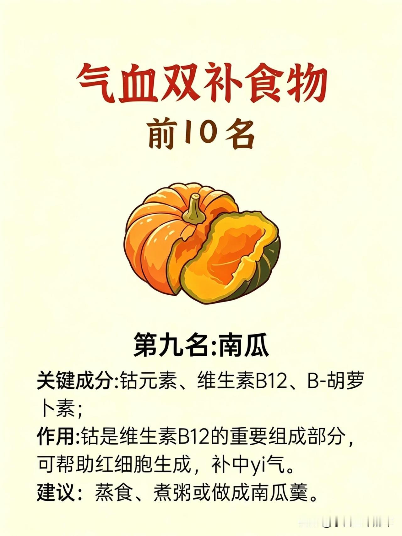第九名是南瓜。钴元素和维生素B12帮我生成红细胞,补中益气。我蒸南瓜当主食,或是煮南瓜粥,温和补气血,肠胃也毫无负担。