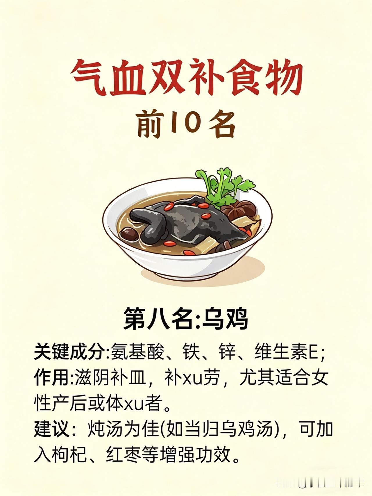 第八名是乌鸡。滋阴补血、补虚劳,特别适合我这种体虚的人。我隔三差五炖当归乌鸡汤,加枸杞红枣,喝完浑身舒畅,姨妈期的痛感也减轻了很多。