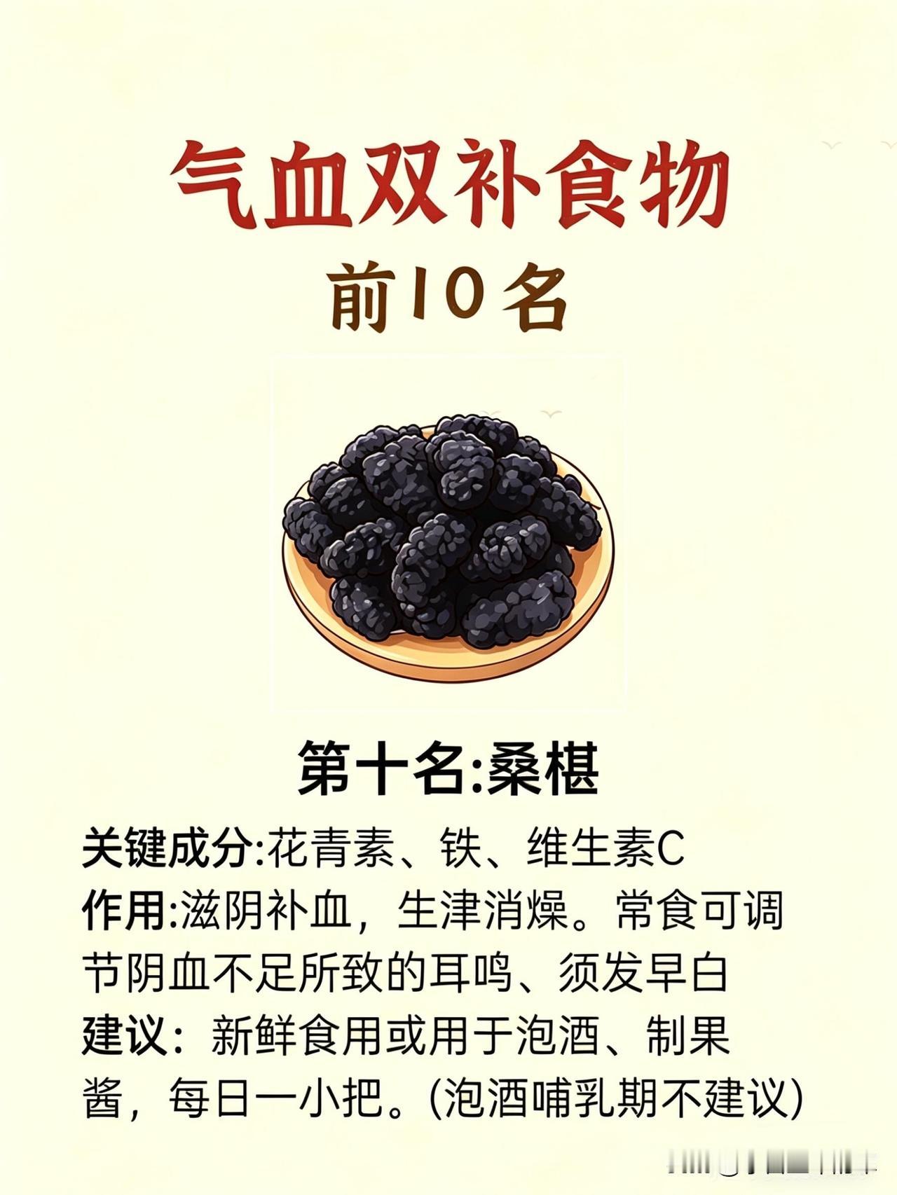 第十名是桑椹。滋阴补血、生津润燥,改善阴血不足导致的耳鸣、白发。我每天吃一小把新鲜桑椹,或是泡成果酱,坚持下来,耳鸣没了,头发也黑亮了不少。
