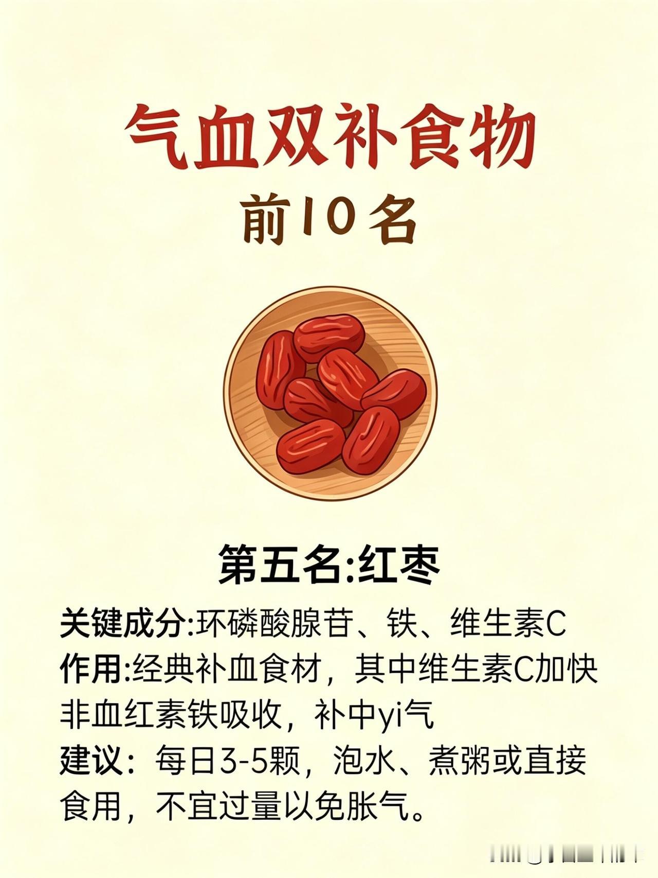 第五名是红枣。经典补血食材,维生素C帮我提升铁的吸收率,补中益气。我每天吃3-5颗,泡水、煮粥都可以,再也不会因为胀气不舒服,气血补得温和又持久。