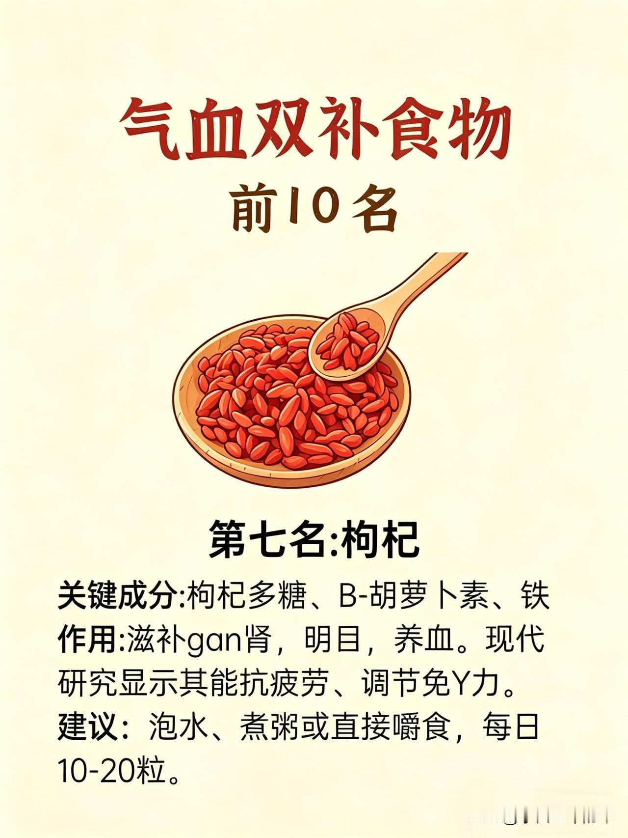 第七名是枸杞。滋补肝肾、养血明目,抗疲劳、调免疫。我每天泡10-20粒在水里,或是直接嚼着吃,上班时眼睛不酸了,精力也越来越足。