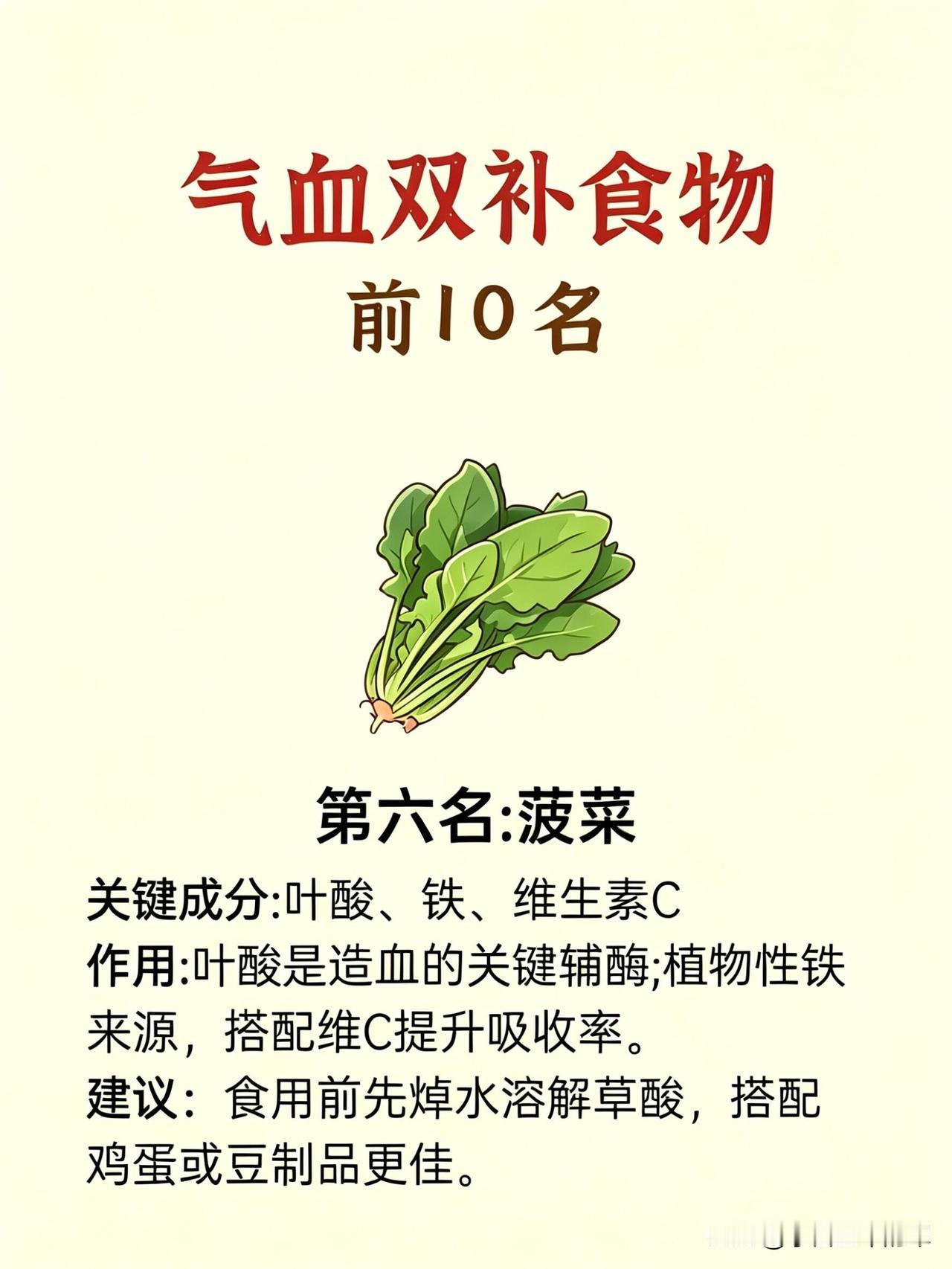 第六名是菠菜。叶酸是造血的关键,搭配维C提升铁的吸收率。我每次吃前先焯水去草酸,炒鸡蛋、涮火锅都吃,给造血系统补够了原料,手脚冰凉的毛病好了大半。