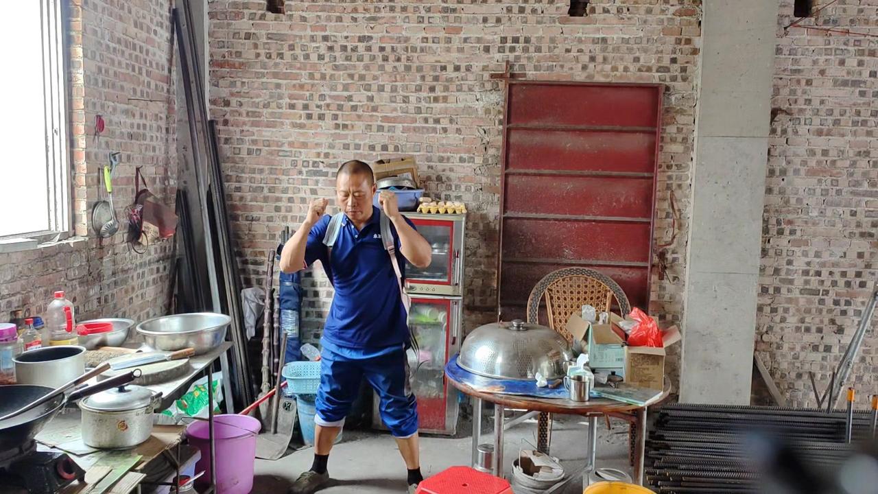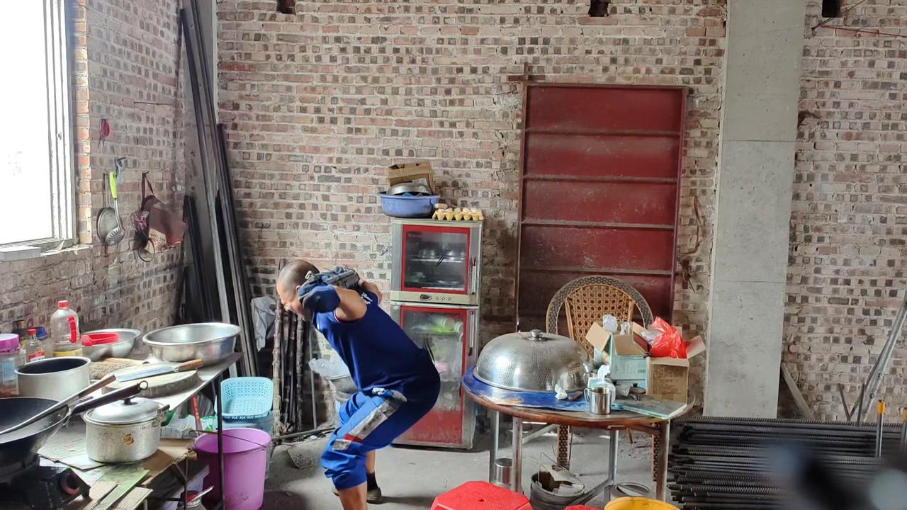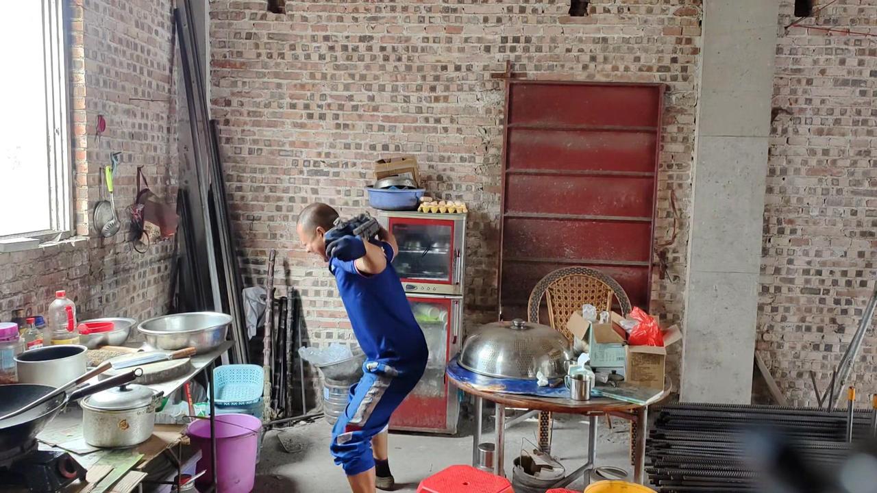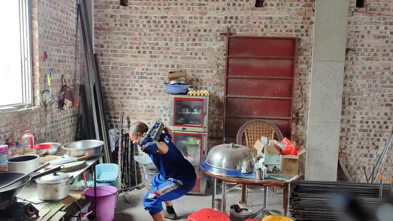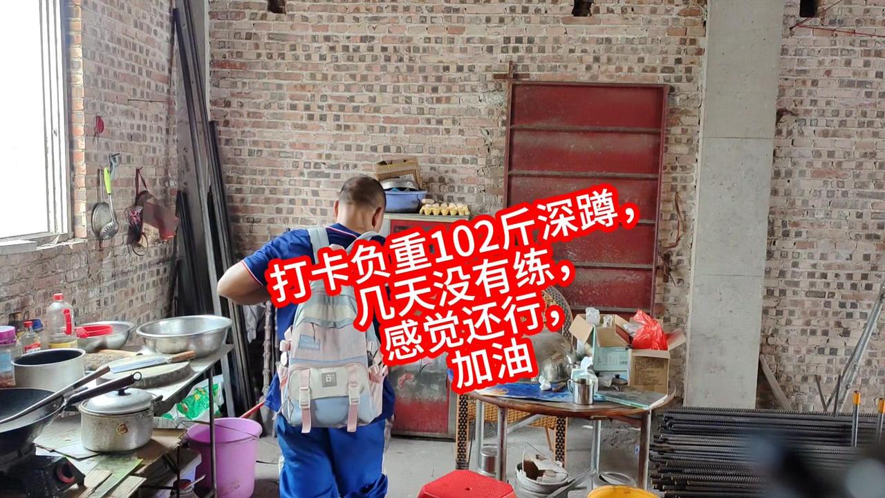平时干活用腰多,现在腰部不得劲,不敢直接负重102斤就练。先背20斤书包试练几个,上肩时还是吃力,毕竟好几天没锻炼了,身体还没完全适应。而且健身房能弯腰放负重,这里要自己搬上去,有点不同。