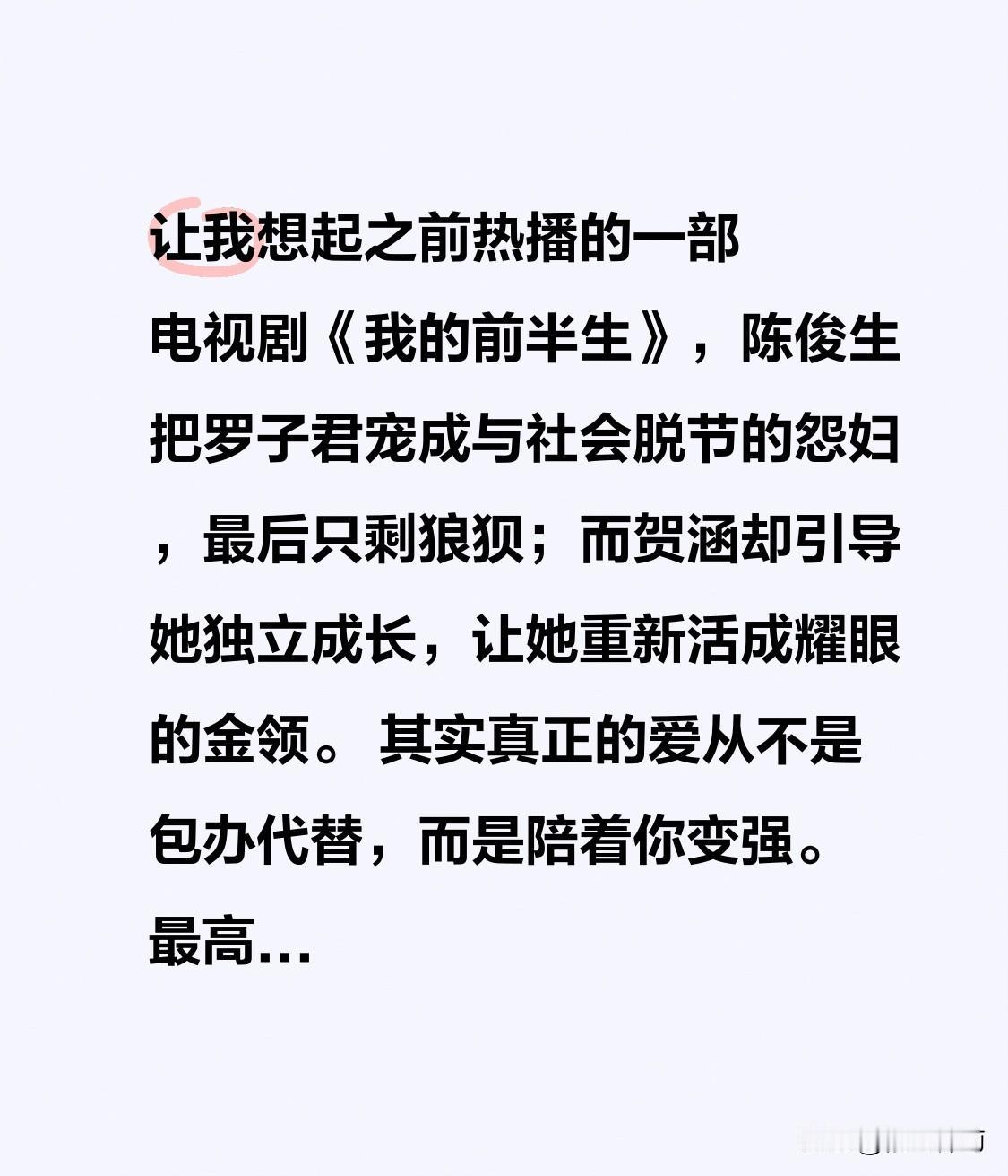这让我想起之前热播的一部电视剧《我的前半生》,陈俊生把罗子君宠成与社会脱节的怨妇,最后只剩狼狈;而贺涵却引导她独立成长,让她重新活成耀眼的金领。
