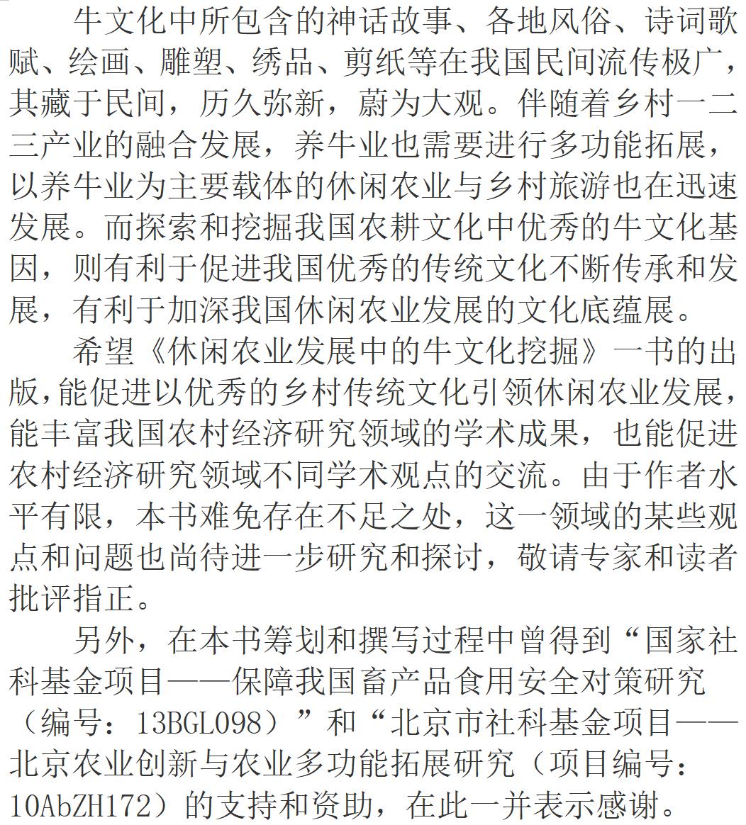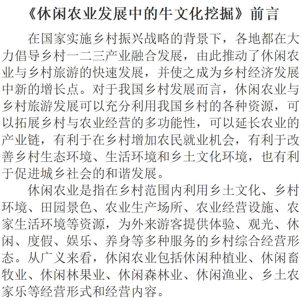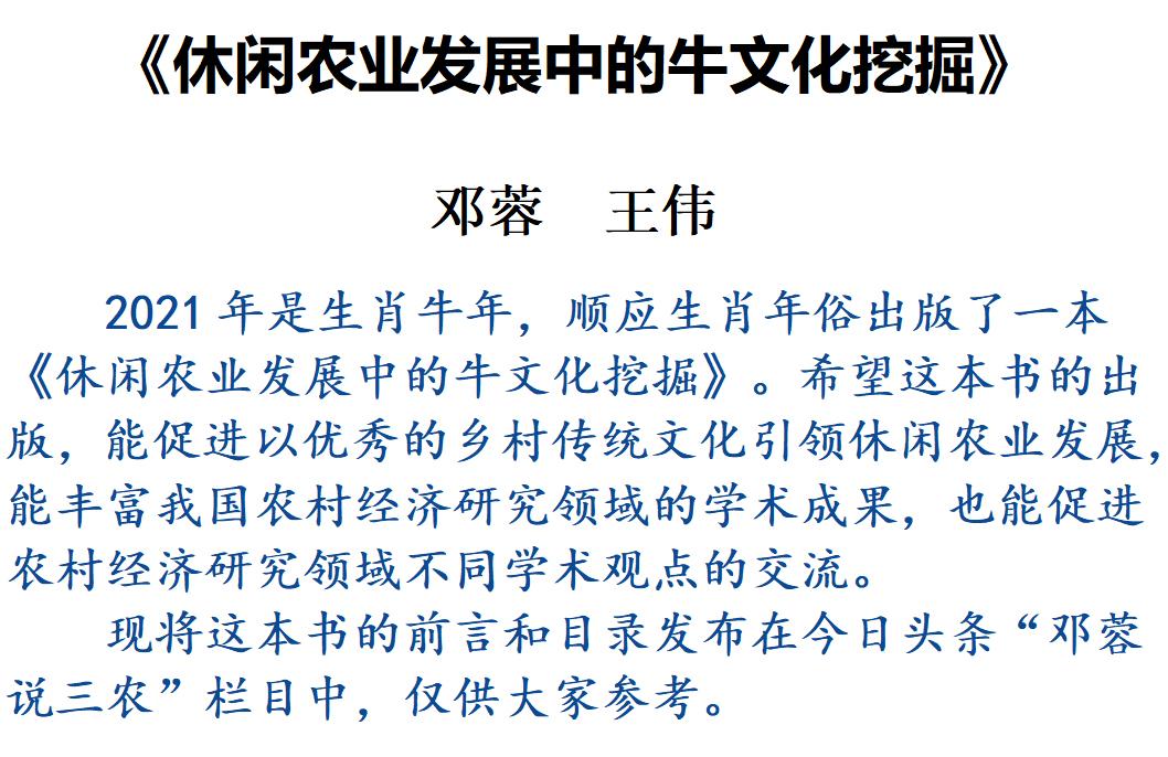 2021年是生肖牛年,顺应生肖年俗出版了一本《休闲农业发展中的牛文化挖掘》。希望这本书的出版,能促进以优秀的乡村传统文化引领休闲农业发展,能丰富我国农村经济研究领域的学术成果,也能促进农村经济研究领域不同学术观点的交流。