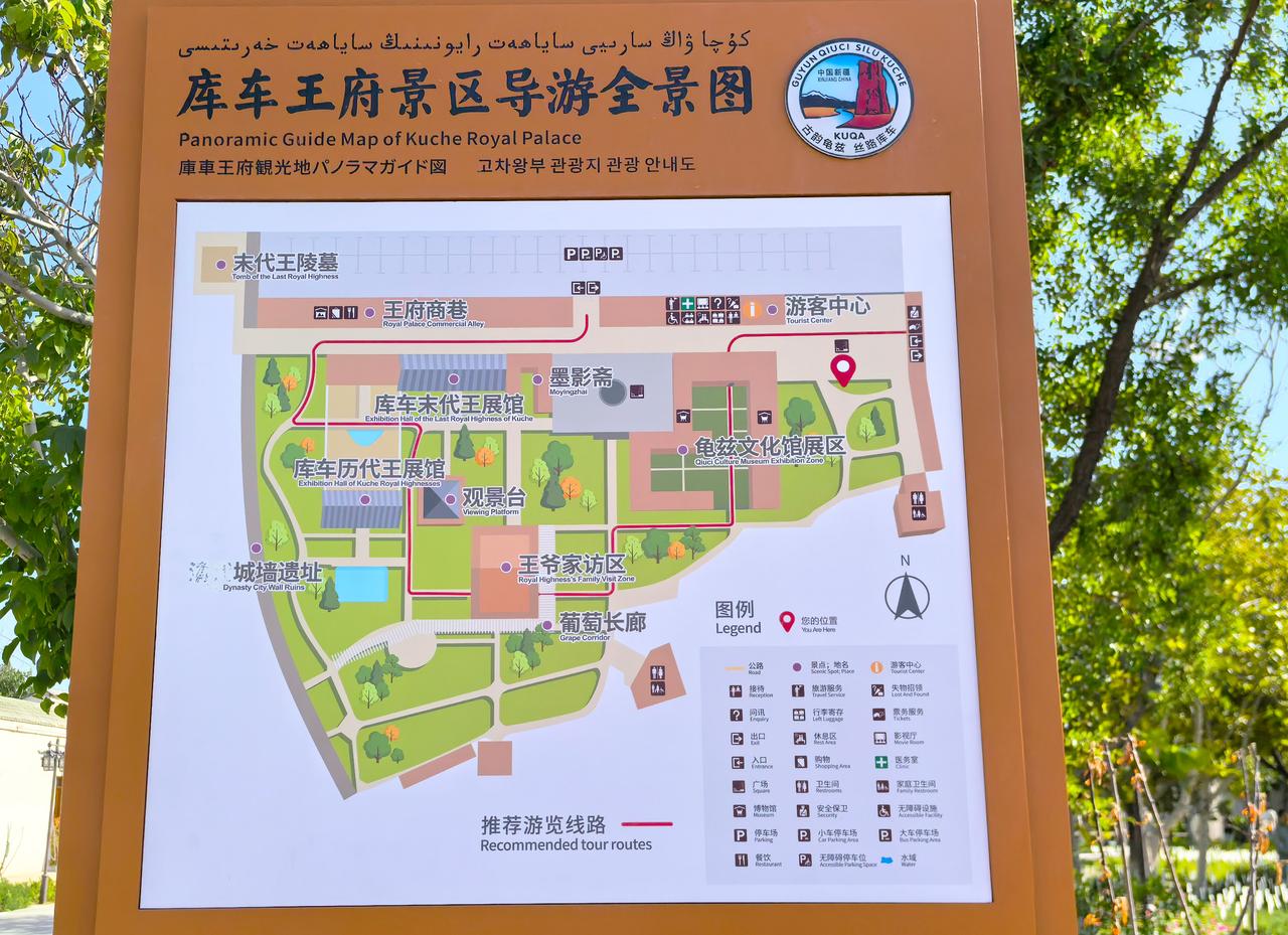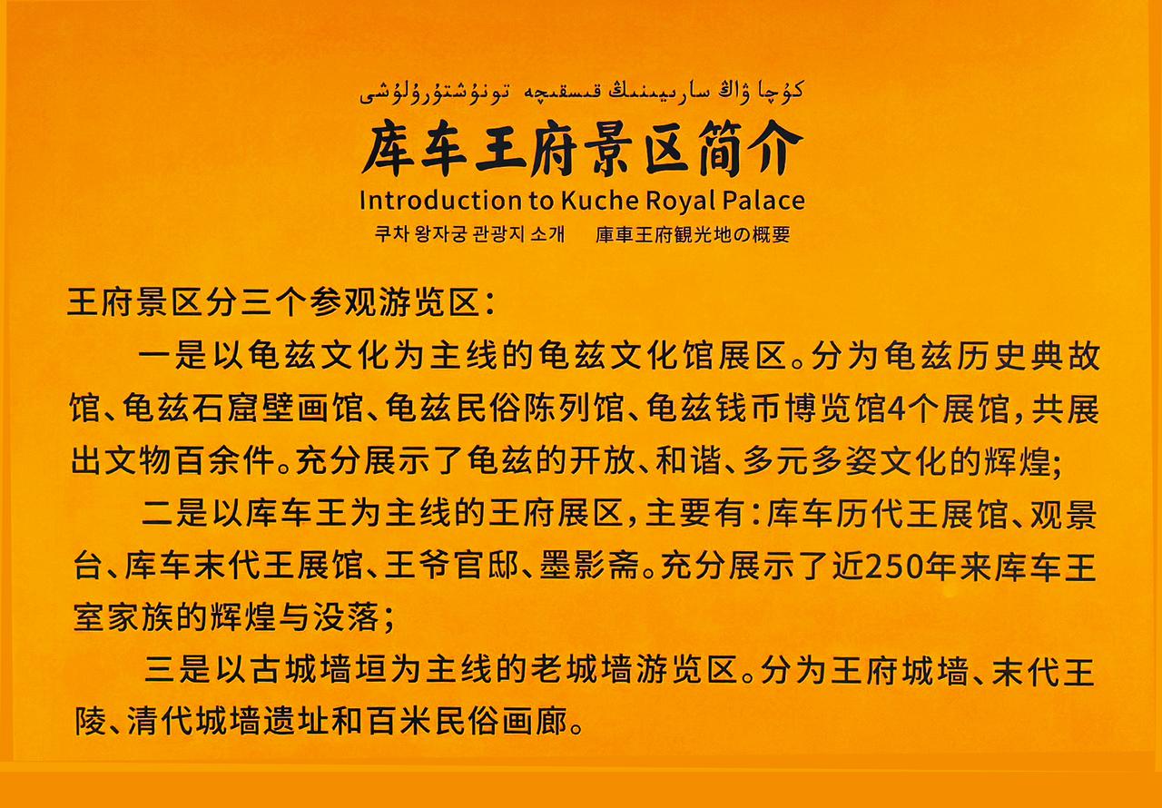 客车王府主要包括三大部分:王府游览区、老城墙游览区、龟兹文化展馆区,在2007年被评定为“国家4A级景区”。