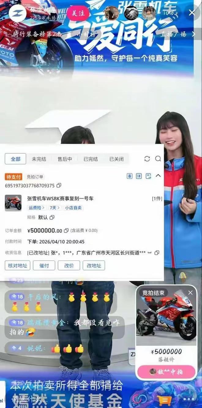 昨日,张雪机车在直播间开启拍卖活动,拍品为其此前斩获摩托车赛事冠军的车型复刻款,还搭配赛事奖状一同竞拍。