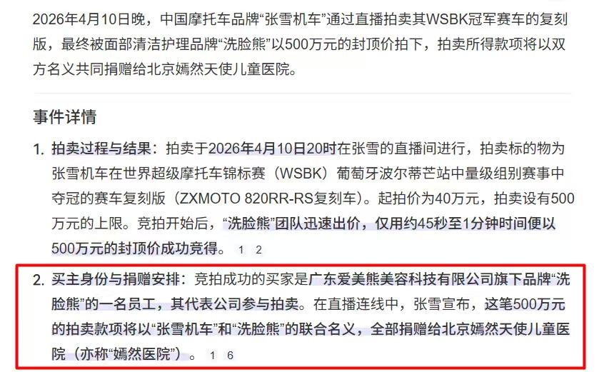 ——500万封顶竞拍冠军复刻摩托!洗脸熊携手张雪机车捐善款延安基金!