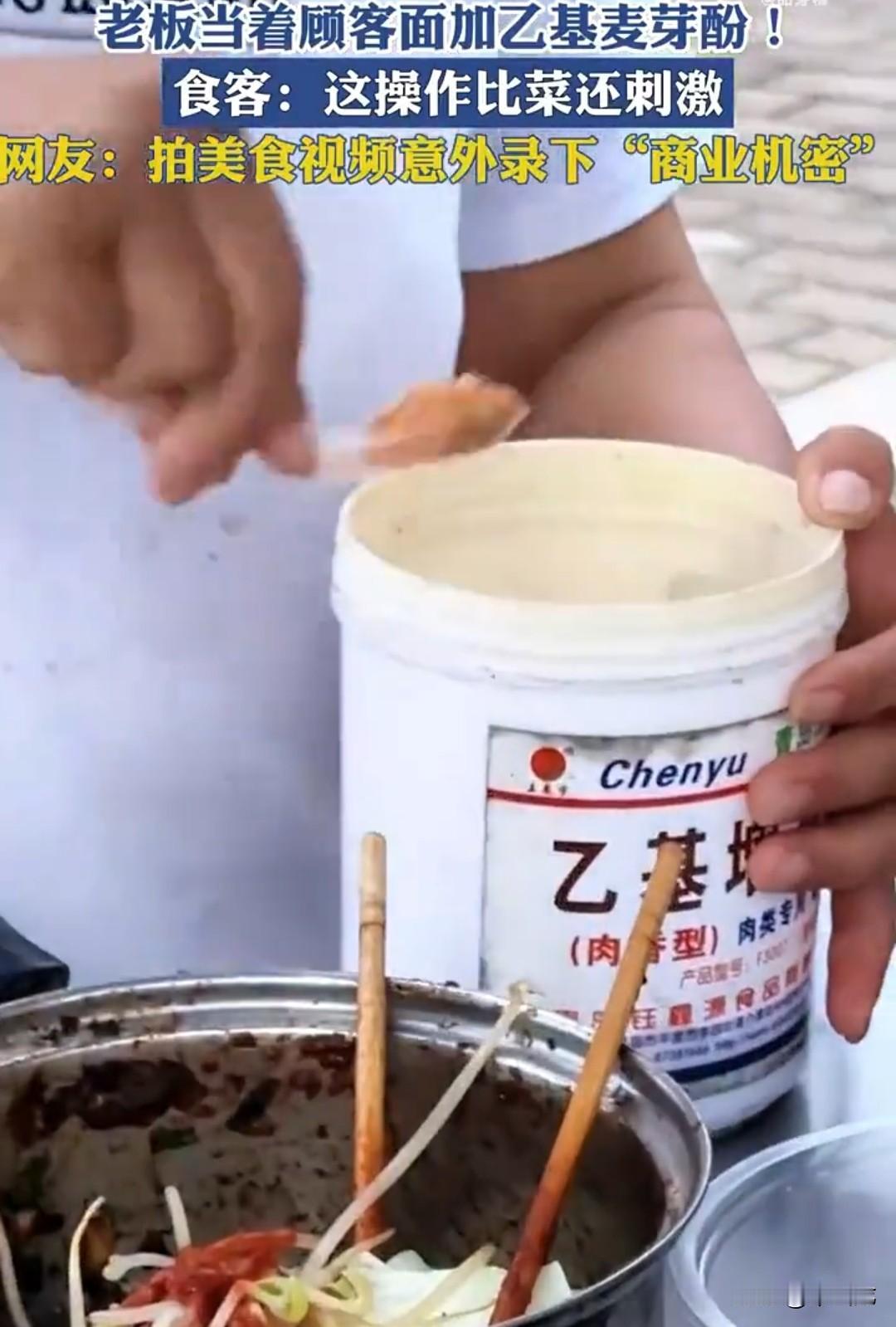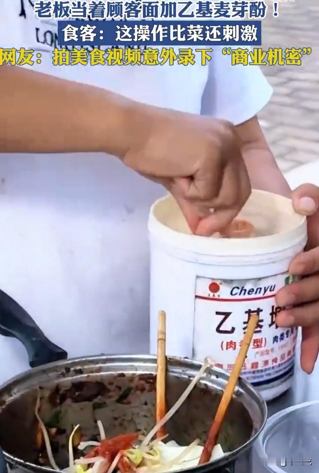 路边油炸烤肠小摊上,老板给顾客拌了一份凉菜,博主发现,老板当着顾客的面,毫无顾忌地打开一罐乙基麦芽酚,舀了一勺直接放到凉菜上。