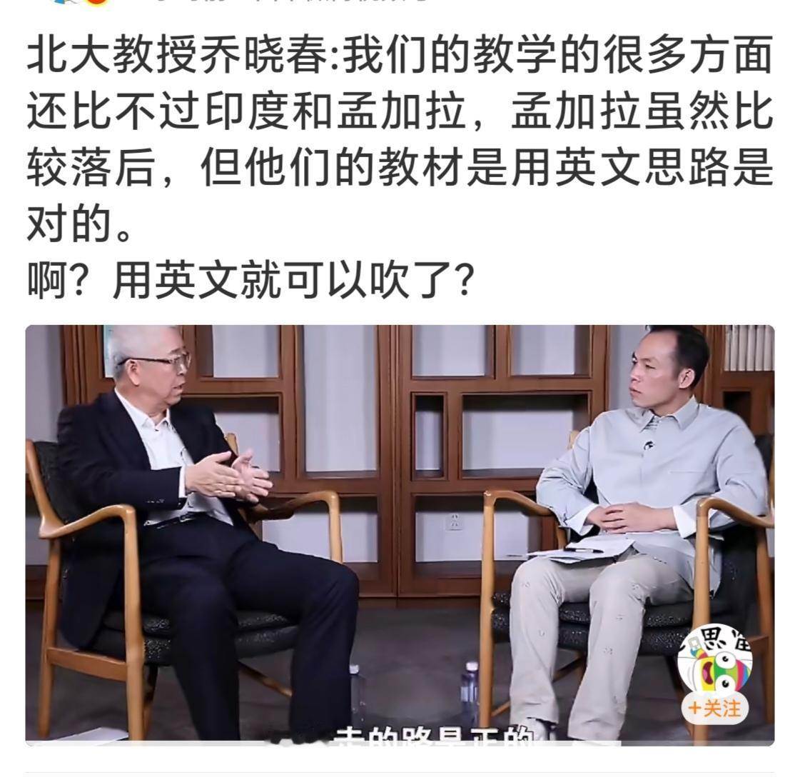 乔晓春说:“我们的教学的很多方面还比不过印度和孟加拉,孟加拉虽然比较落后,但他们的教材是用英文思路是对的”。乔晓春作为辽宁大学的毕业生和北大教授,说出这种话实在让人震惊。凡是有点常识的人都不会认为中国的教育比孟加拉国落后。乔晓春认为教材用英文思路就是先进的,更是荒唐至极。很多非洲国家独立前都是英国或法国的殖民地,他们不但教材用英文或法文的思路,连做梦都用英文或法文,也没见到他们先进到哪去。