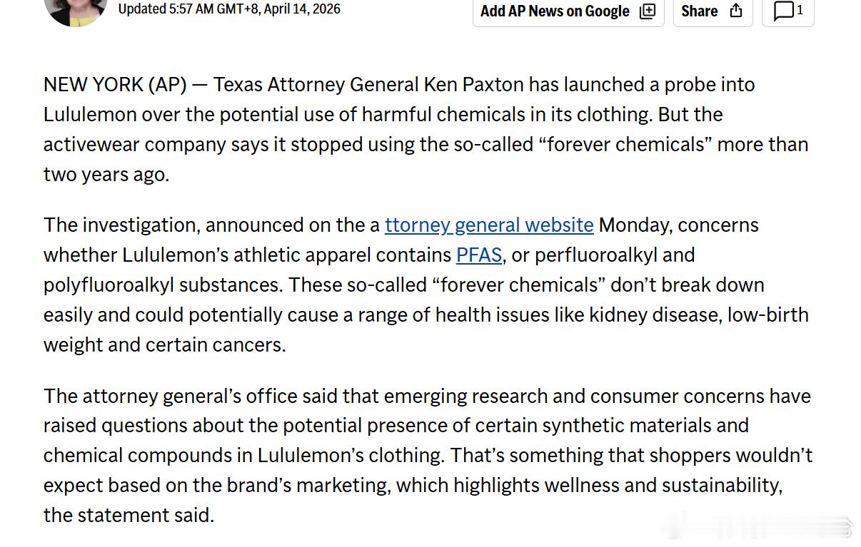 lululemon或与不孕等风险相关 主打 “健康生活方式” 的 lululemon,突然被美国得州调查产品含PFAS 永久化学物,直指和内分泌紊乱、不孕、癌症风险相关。