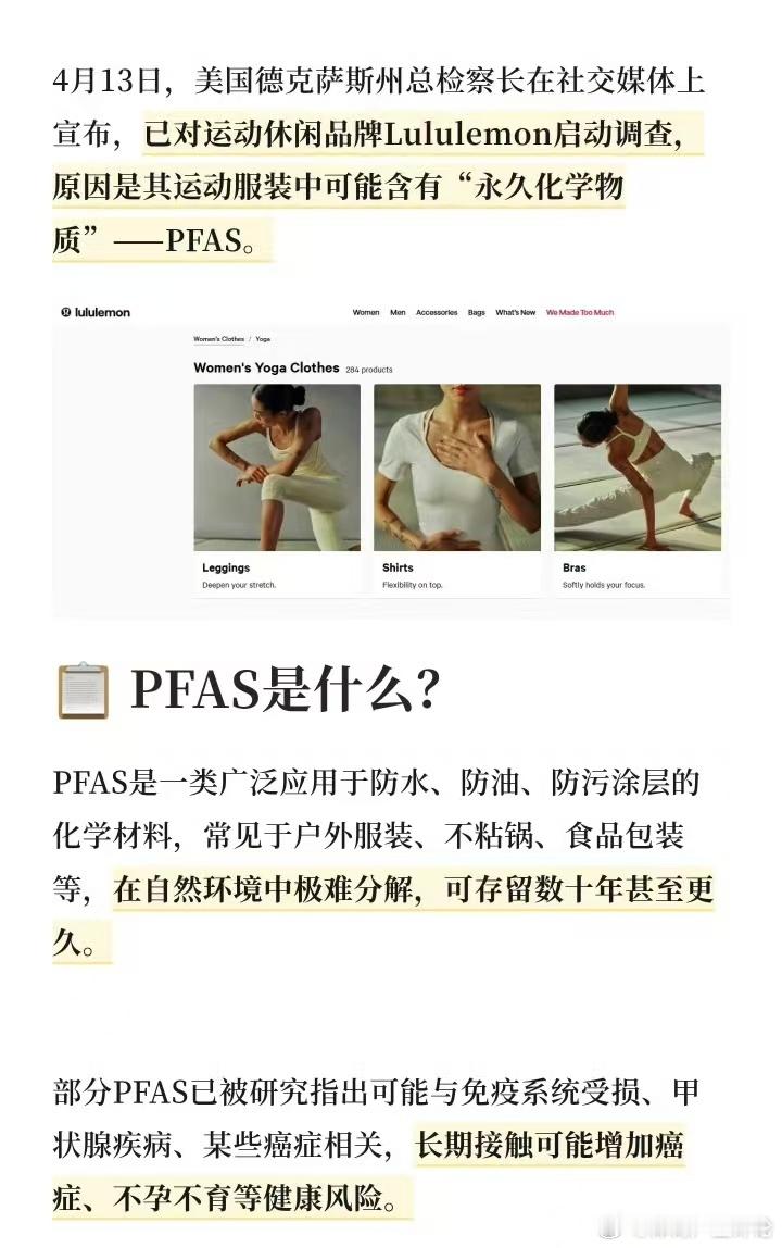 lululemon或与不孕等风险相关lululemon还能穿吗 这一波 PFAS 调查,对 Lululemon 来说真不是简单的舆情事件,更像是压在身上的又一根稻草。