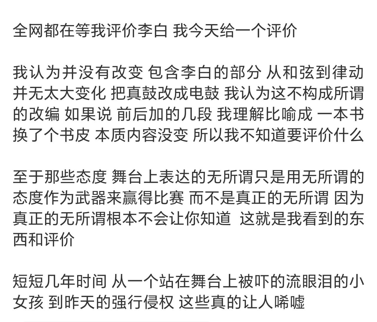 单依纯改编的李白,虽然有了改变,但是本质上是换书皮,仅仅将真鼓部分改为电鼓,和弦和律动没有改变,新增的段落也没有改变核心内容,不是真正的艺术创新。