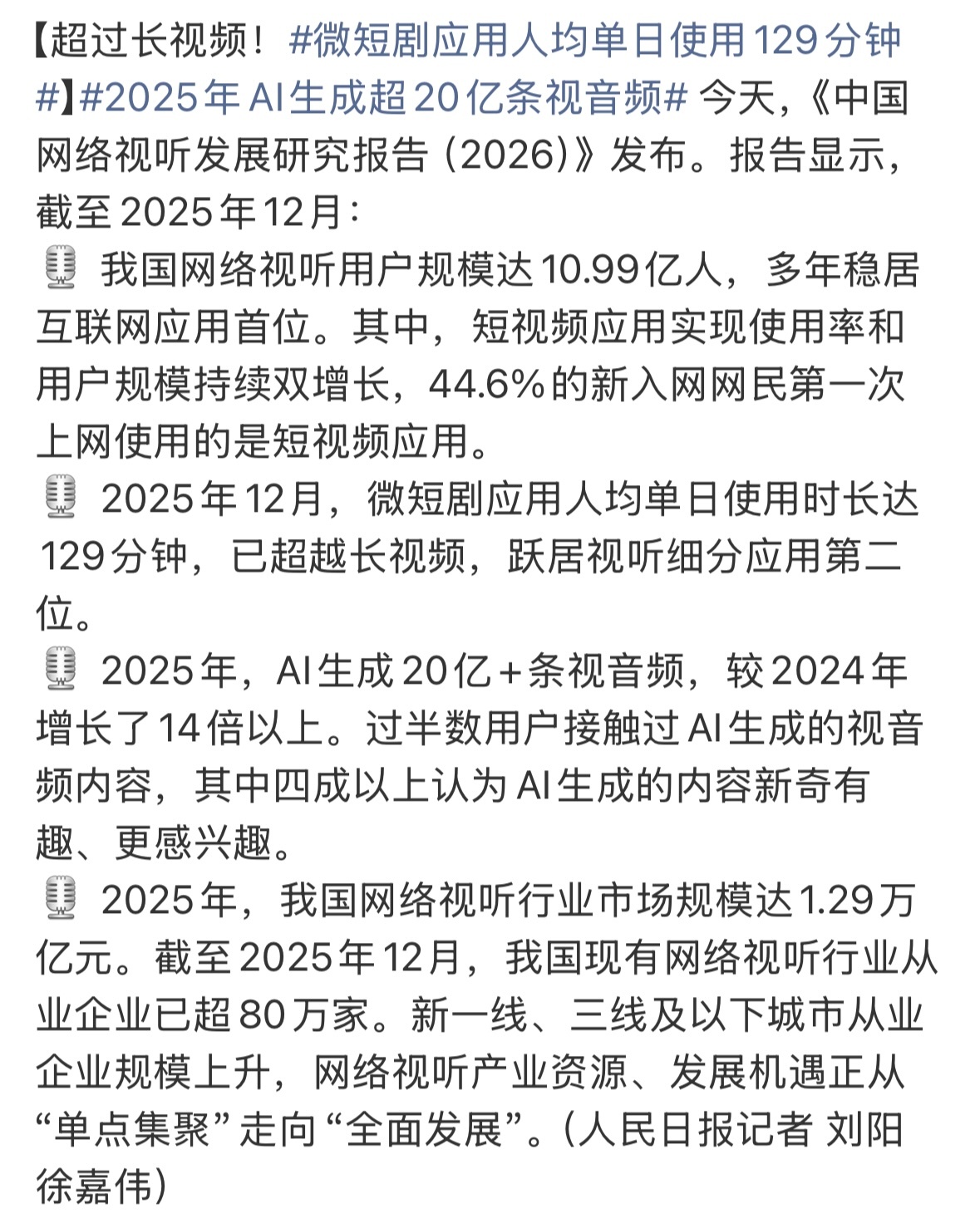 AI生成视音频一年翻14倍,20亿+条。过半用户接触过,四成觉得新奇有趣。内容生产正在被重新定义,而且普通人接受度比想象中要高。