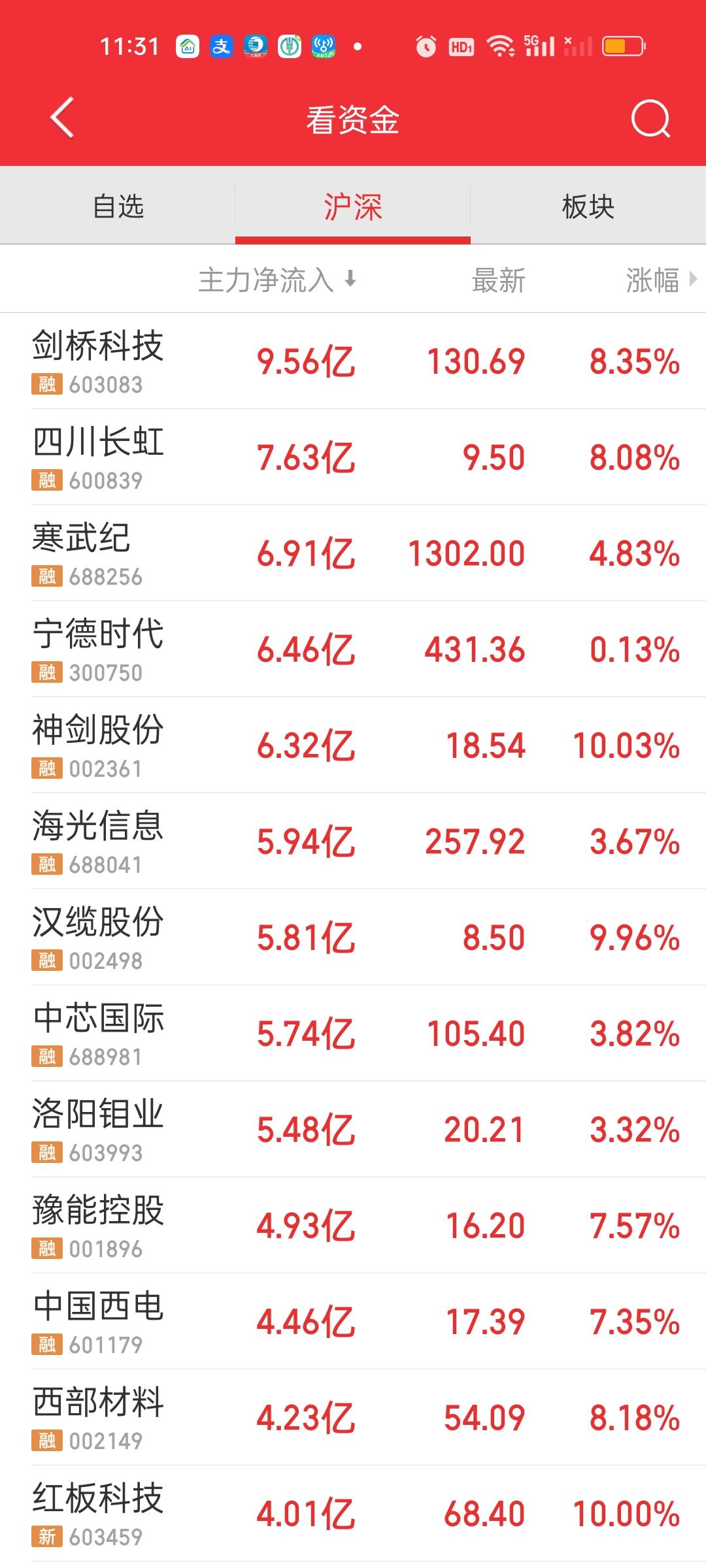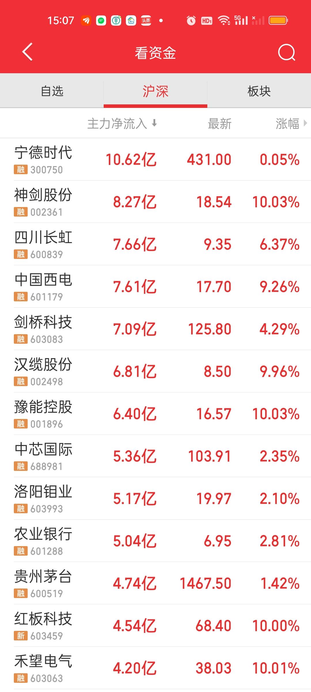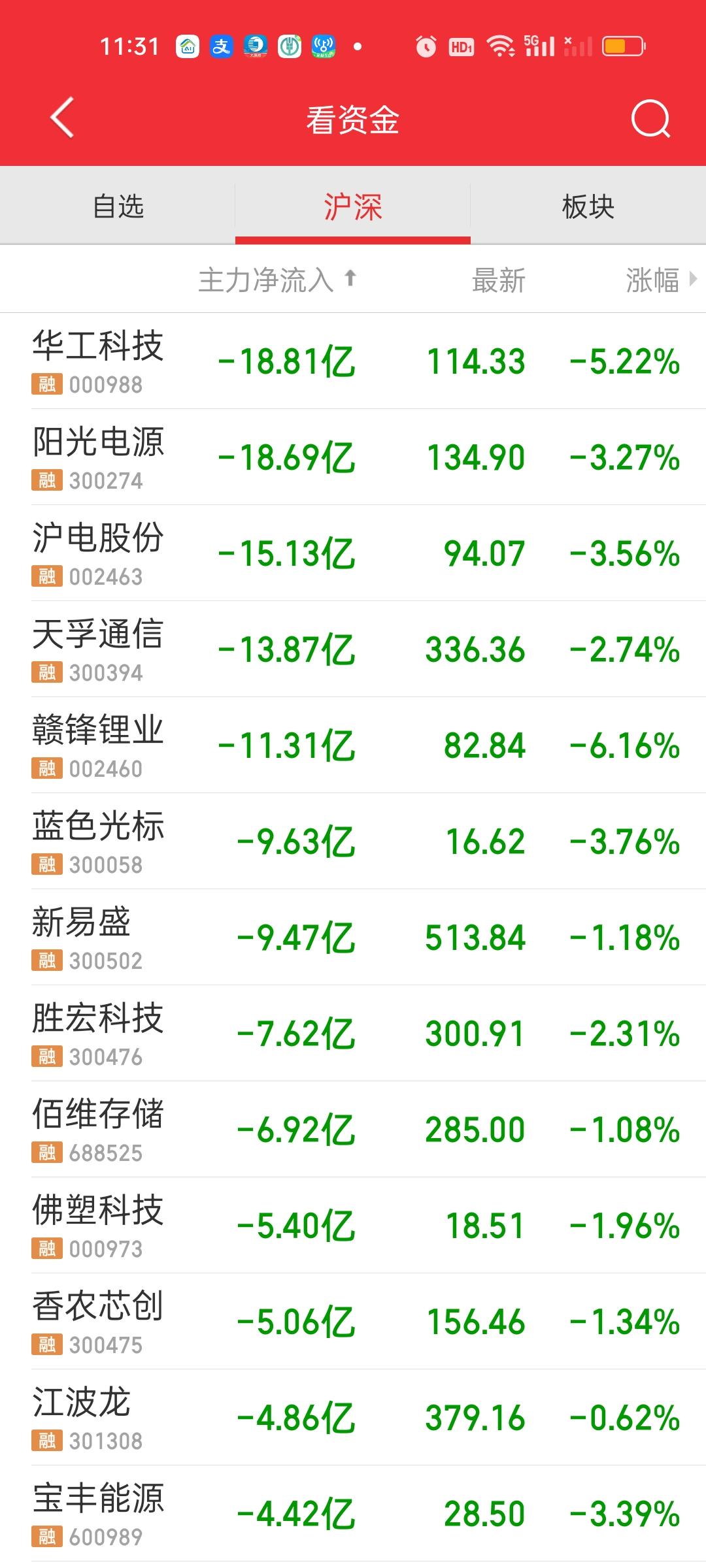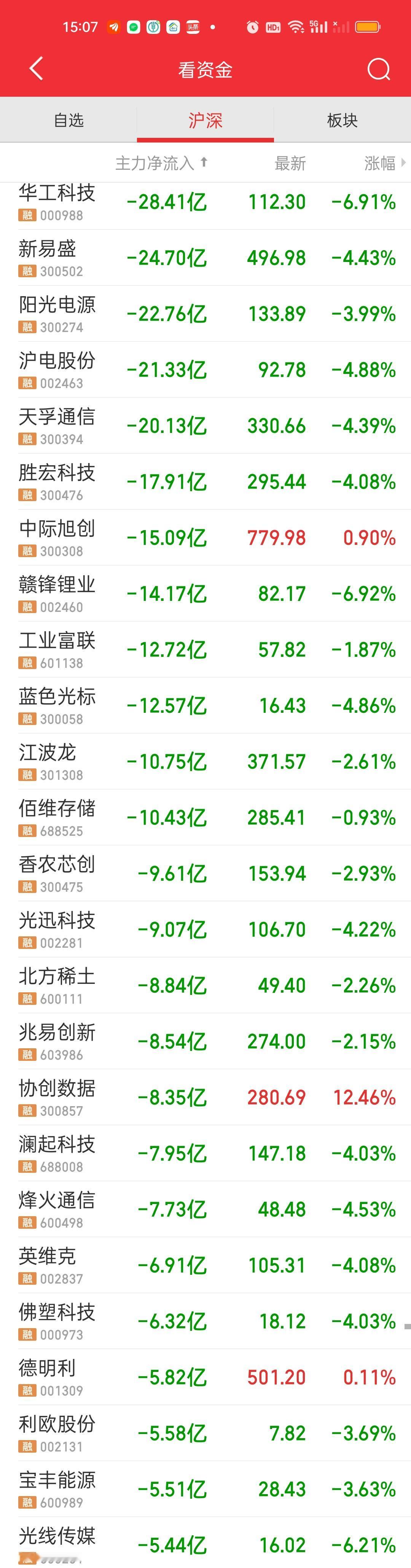 今天只有宁德时代主力净流入在10亿以上,净流出资金在10亿以上的个股下午大幅增加,其中华工科技,阳光电源,新易盛,沪电股份,天孚通信净流出资金在20亿以上,下午更是加速流出。胜宏科技和中际旭创净流出资金在15亿以上。那你觉得大盘资金净流出了950亿,有没有这几个的功劳呢?易中天+胜宏+沪电资金都在加速流出,有没有可能抱团在逐步开始瓦解?