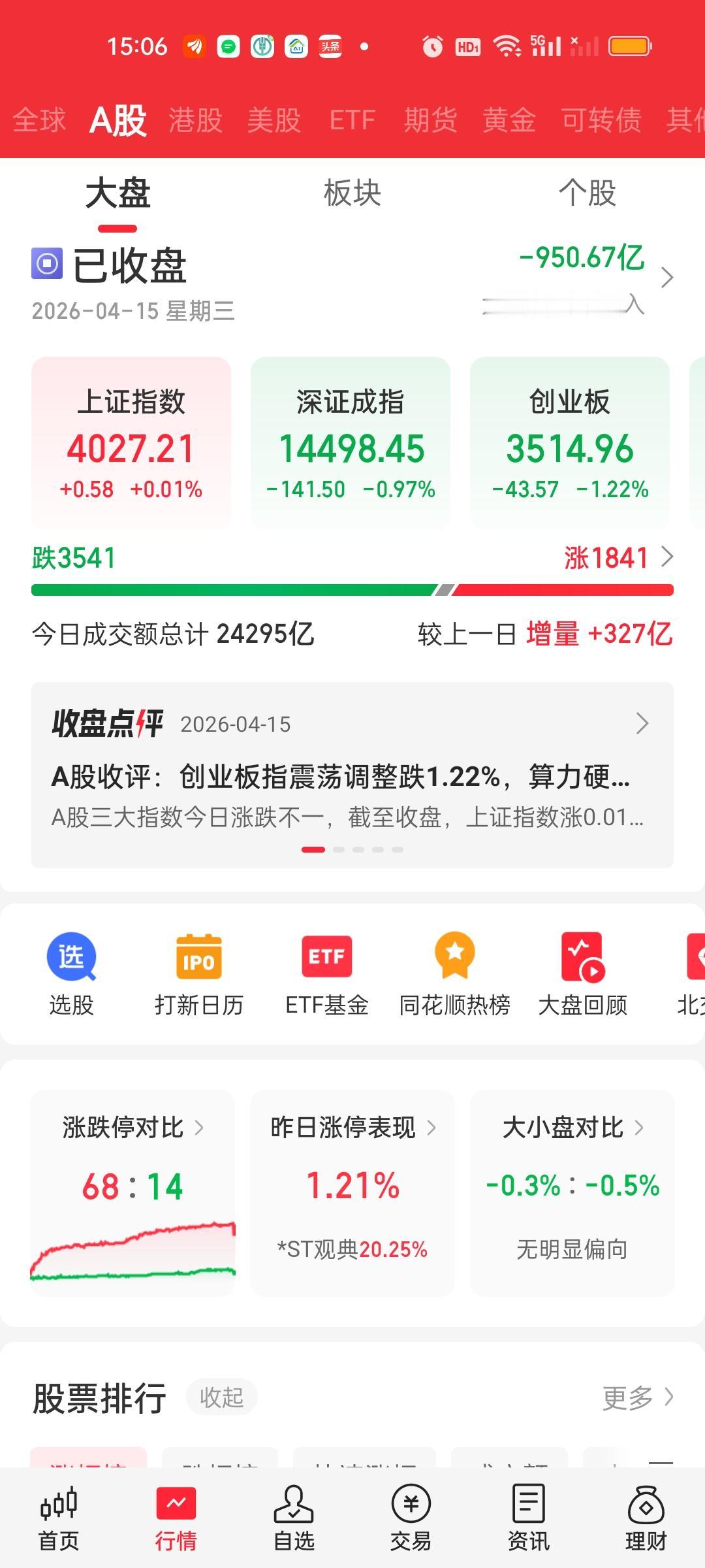 收盘了,个股超3500家下跌但指数收了红盘,这个就有意思了。可以很明显的看到各大